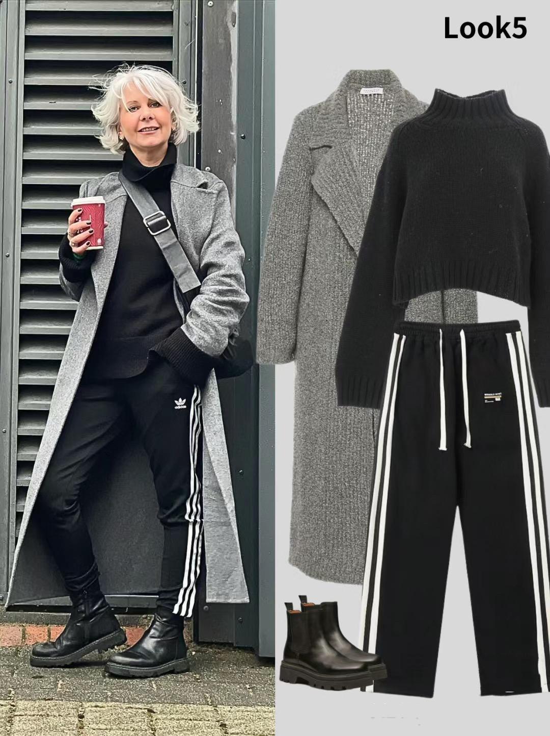 60+的奶奶輩,即便是滿頭印發、也可以表現出活力十足的風格。一件人字紋的大衣,配條紋修飾的運動褲,就讓整體風格彰顯活力。