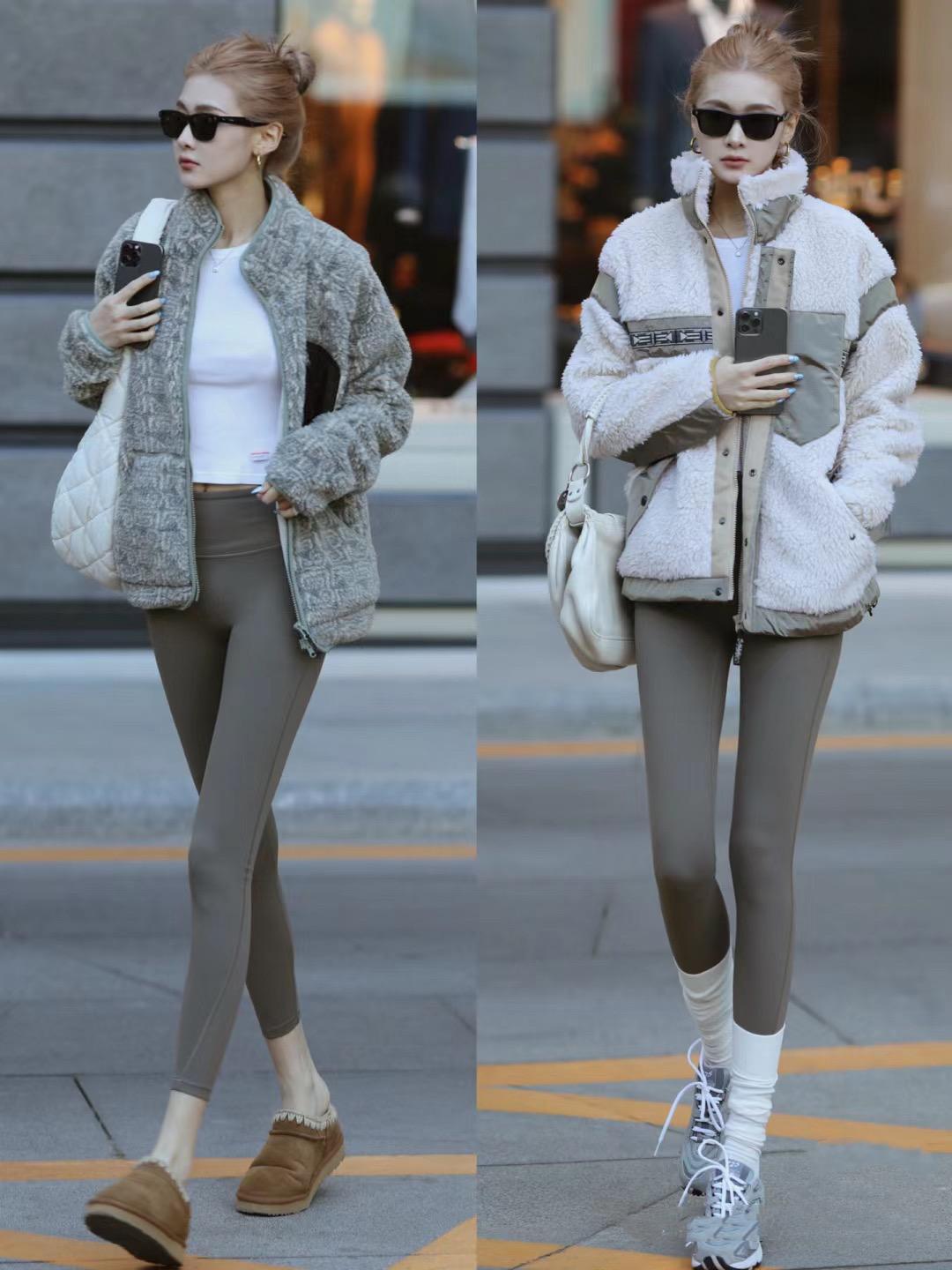 像這種寬鬆的毛絨外套,配上高腰的鯊魚褲,可以把優越的雙腿線條表現出來。歐美風的穿搭中,鯊魚褲的出鏡率還是蠻高的,配雪地靴還是運動鞋都很有範。