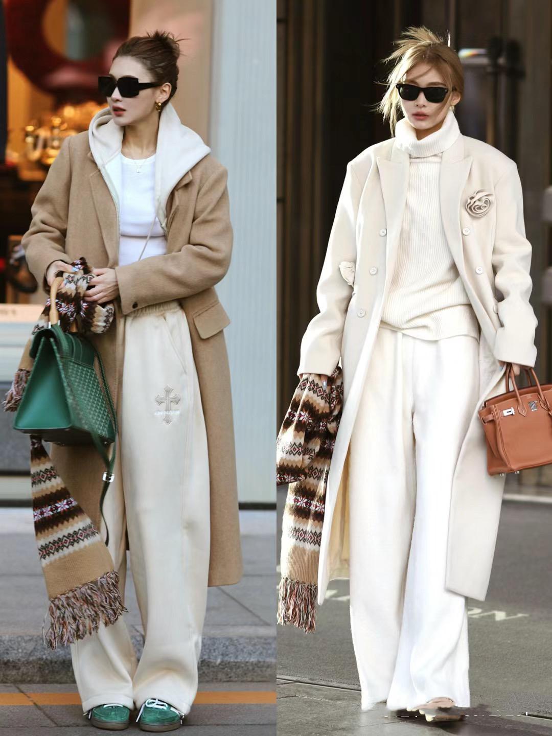 雙面呢的毛呢外套,在歐美通勤風穿搭中也是非常實穿的。比如利落的毛呢外套,可以搭配高腰的闊腿西褲來穿着,帥氣拉風氣場十足。