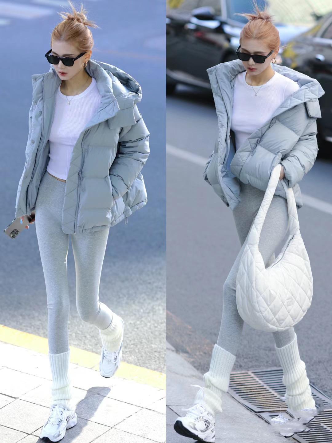 稍微寬鬆的藍灰色羽絨服,搭配了高腰的灰色鯊魚褲,清新的配色有着活力十足的運動風。想要提升層次感,還可以在灰色鯊魚褲的基礎上搭堆堆襪,保暖又洋氣。