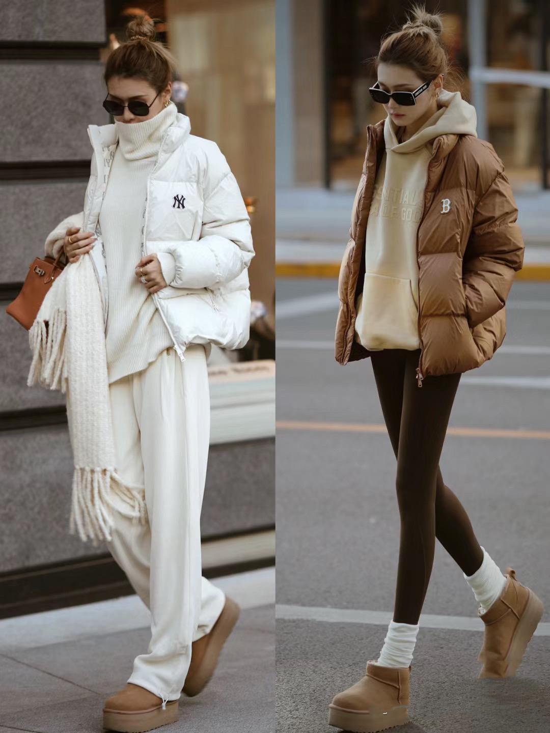 棕色系的羽絨服,疊搭連帽衛衣,帥氣又時髦。像這種緊身的鯊魚褲直接單穿,真適合雙腿線條筆直挺拔的女性,高個子的女生一雙大長腿真醒目,鯊魚褲搭配堆堆襪,顯得雙腿更細長。