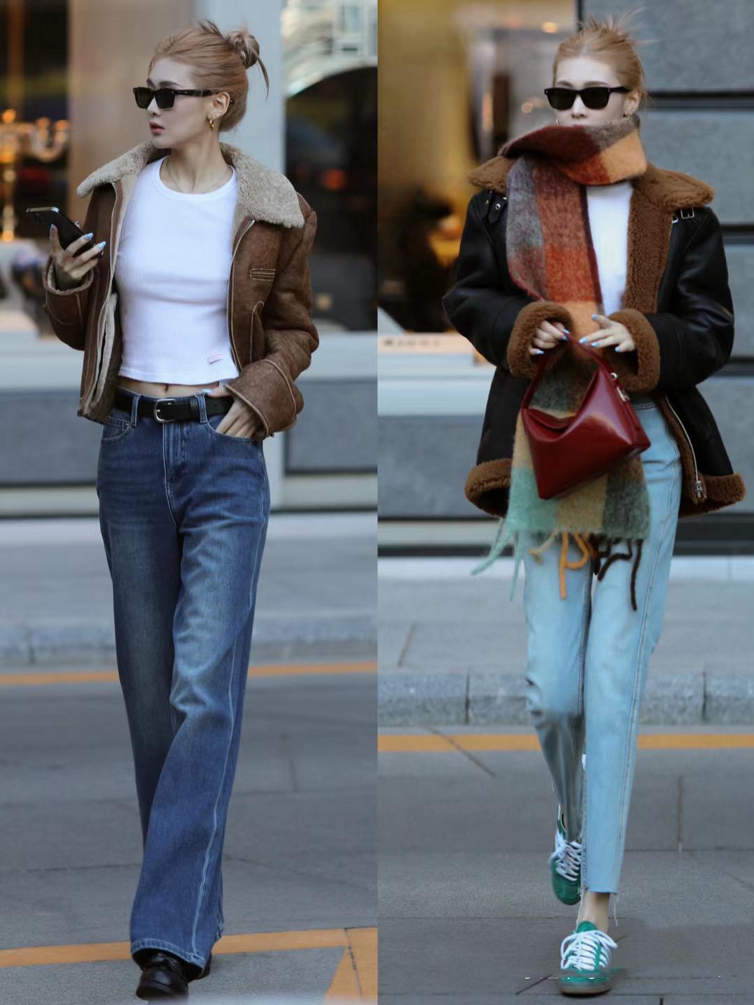 酷感十足的街頭風穿搭,以皮毛一體外套、高腰的直筒牛仔褲、基礎款T恤爲主要單品,經典耐看、風格時尚的組合,才更加惹人注目。
