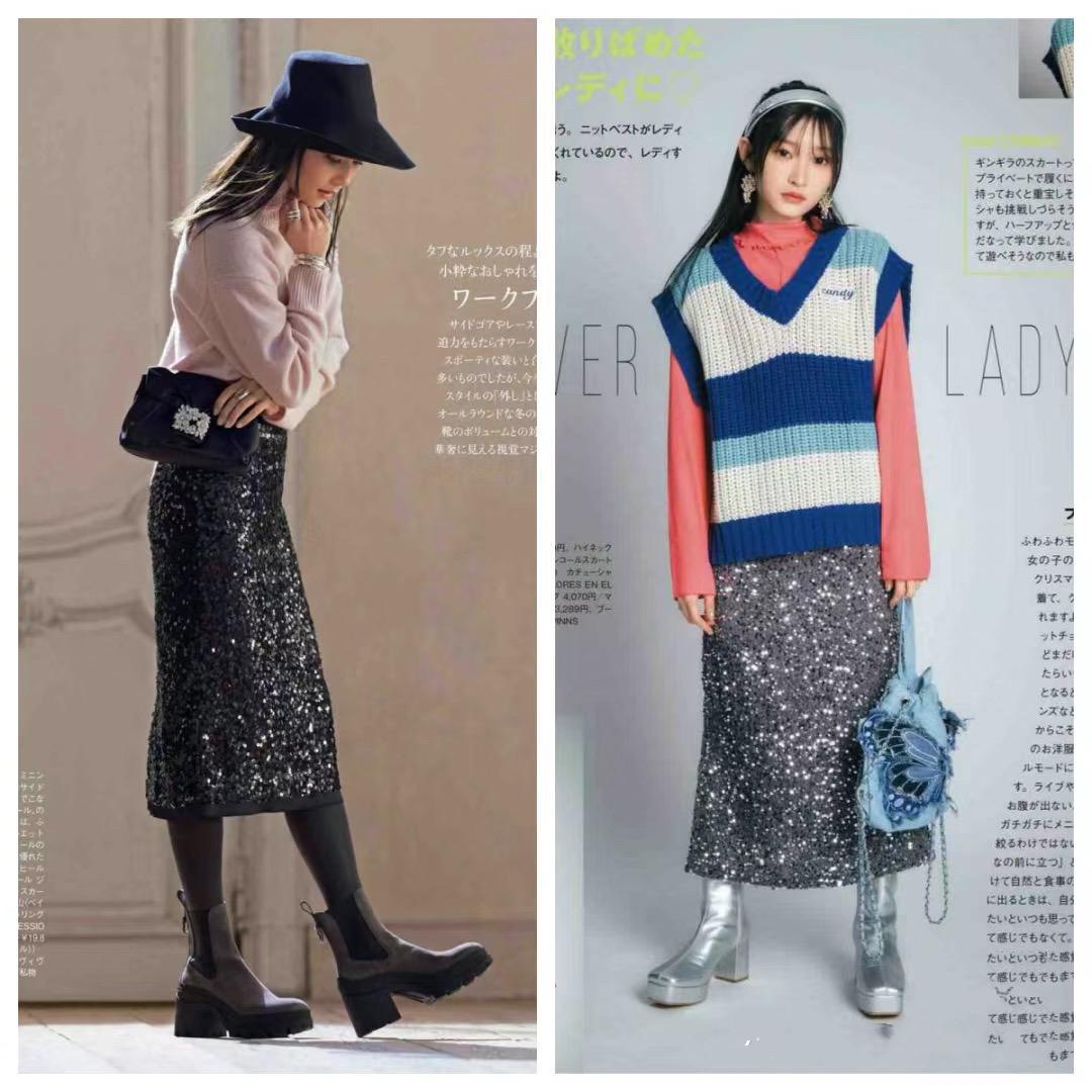 修身的亮片半身裙,可以配基礎款的打底衫或者寬鬆的針織衫。基礎款打底衫,配修身的亮片半身裙,勾勒出腰臀部的線條,時髦又精緻。