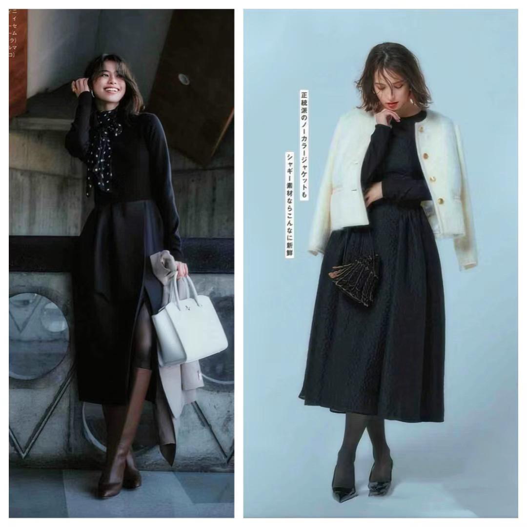 白色小香風外套疊搭經典的黑色打底衫,顯得上身比例更加纖薄。配一條高腰的黑色半身裙,寬鬆的裙襬可以包容40+女性的臃腫。黑色半身裙寬鬆的版型,舒適又具備了包容性。