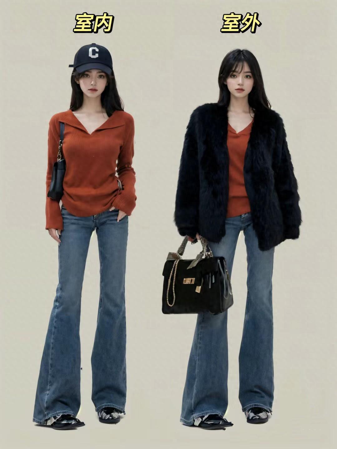 像這種磚紅色的針織衫,修身的款式穿起來更加時髦顯瘦。我們配高腰的微喇褲,可以顯得雙腿線條筆直挺拔。外出的話,披一件皮草外套、就充斥着時尚與貴氣。