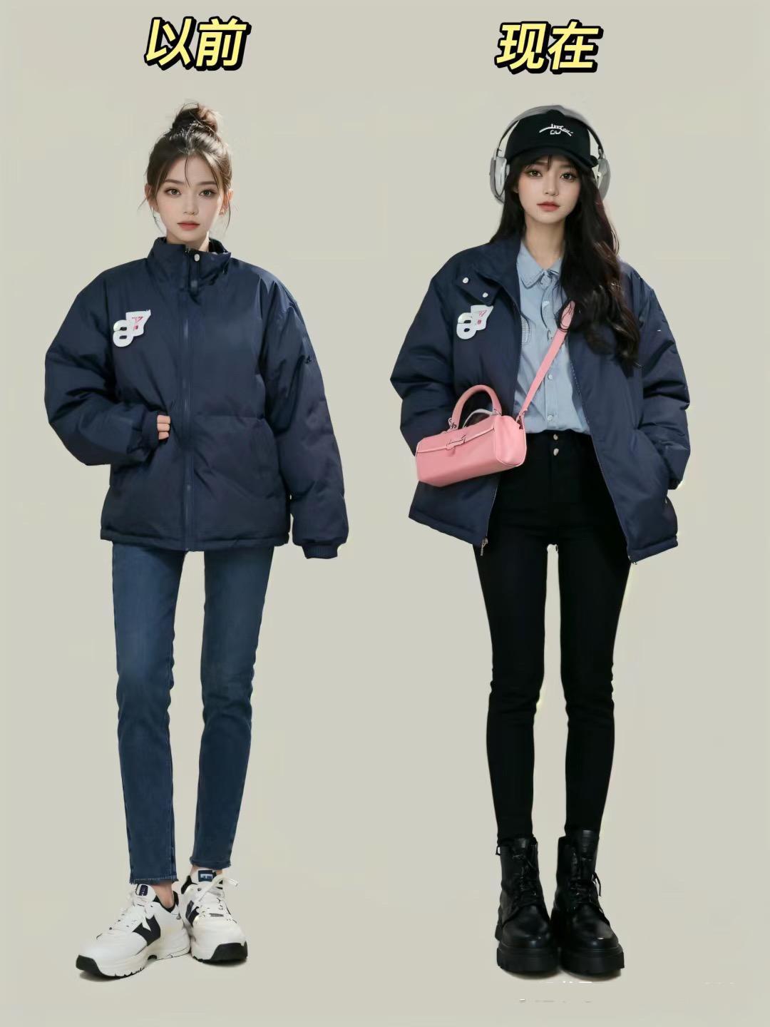 如果想要顯腿長的話,可以將棉服的拉鍊拉開,露出淺色系的內搭,更凸顯溫柔氣質。一條小黑褲,搭配淺藍色襯衫,顯得雙腿纖細修長。高腰的小黑褲,顯瘦效果也不錯。