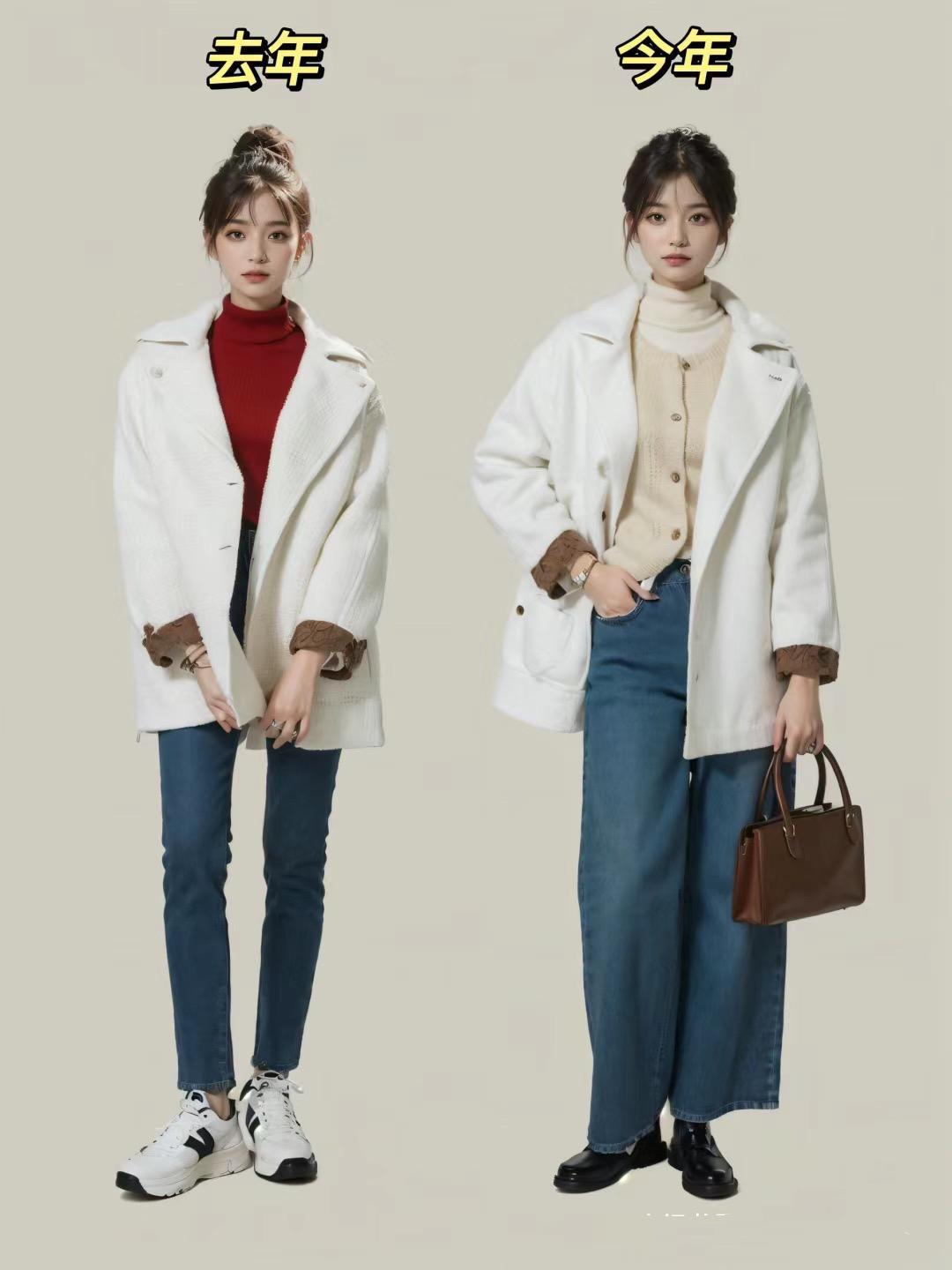 一件白色系的短款毛呢外套,搭配經典的直筒牛仔褲,上松下緊的穿着方式、時髦洋氣又很顯腿細,這樣的穿着方式,適合雙腿線條比較細長的人羣。