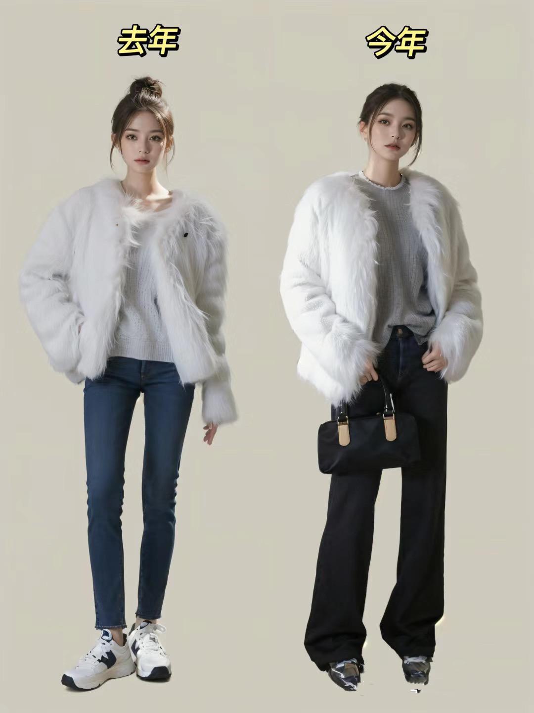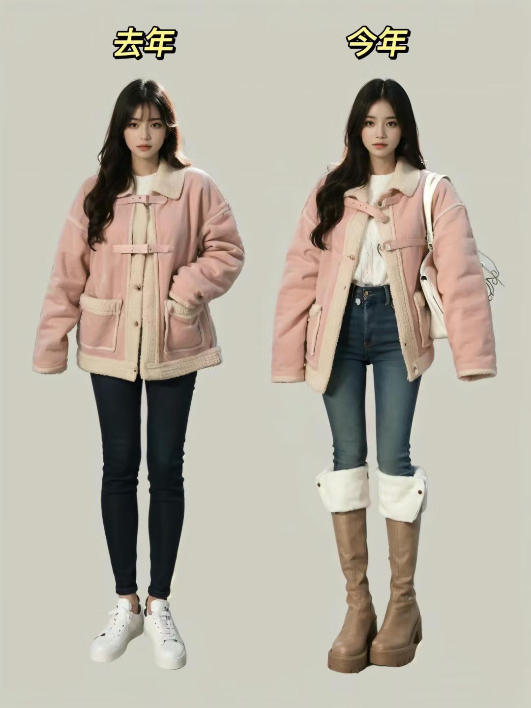 我們用粉色皮毛一體外套,配上修身的小黑褲,上松下緊的搭配、更加顯腿細。如果小腿線條粗壯的話,我們就選擇右側的搭配,配一雙厚底長筒靴,酷颯拉風還修飾腿型。
