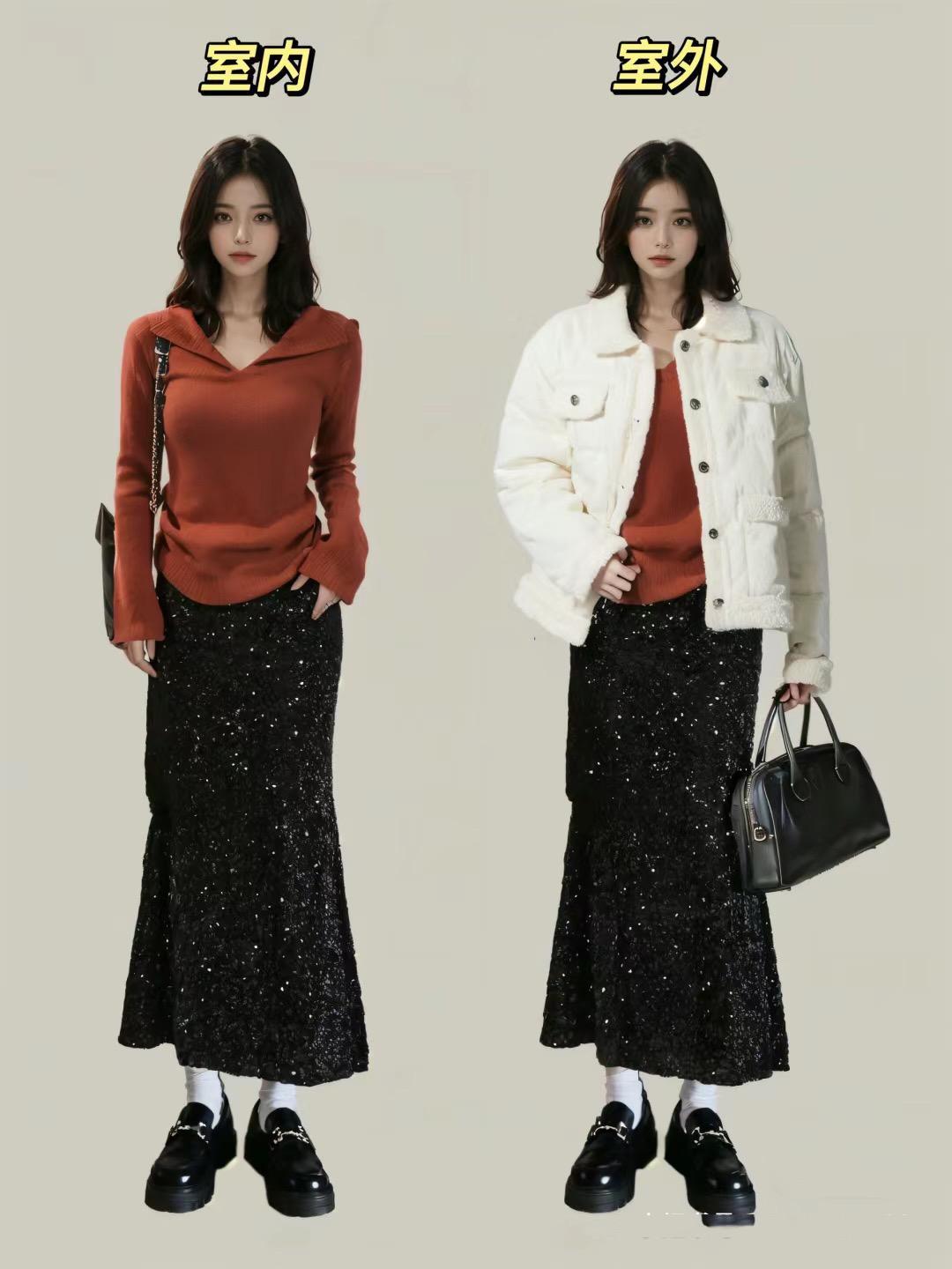 像這種磚紅色的針織衫,搭配黑色魚尾半身裙,高貴貴氣又很顯白。如果要在室外穿着的話,搭一件短款的毛絨外套就很利落,這種黑色魚尾半身裙,過膝的長度更顯端莊。