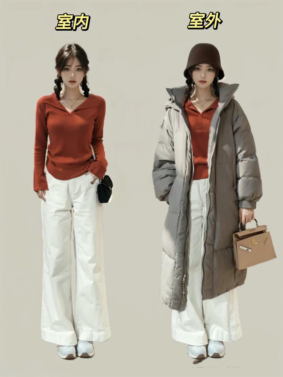 修身的磚紅色針織衫,配上寬鬆的闊腿褲,可以表現出上窄下寬的效果。這種高腰的闊腿褲,配上清新的白色系,更加溫和柔美。搭一件寬鬆的羽絨服、時尚又保暖。