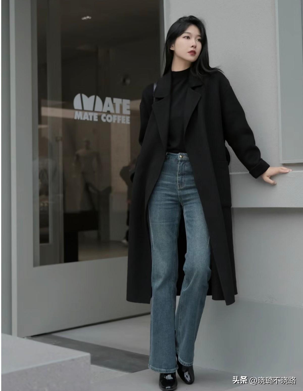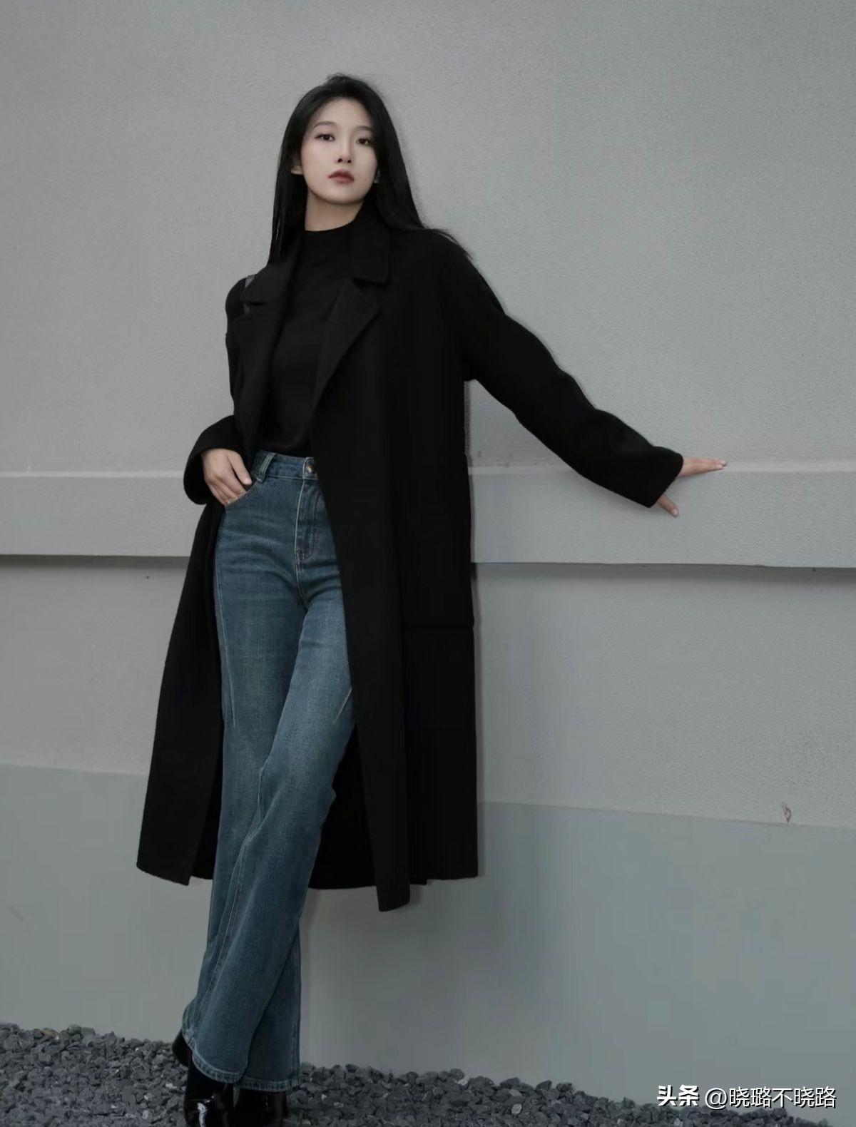 大衣和長款的直筒牛仔褲進行疊穿也建議大家選擇一些低明度的顏色,第1點的話是一定要保證我們身形的纖細感,第2種的話則是線條走向是一定要有着非常明顯的優化和修直強調。