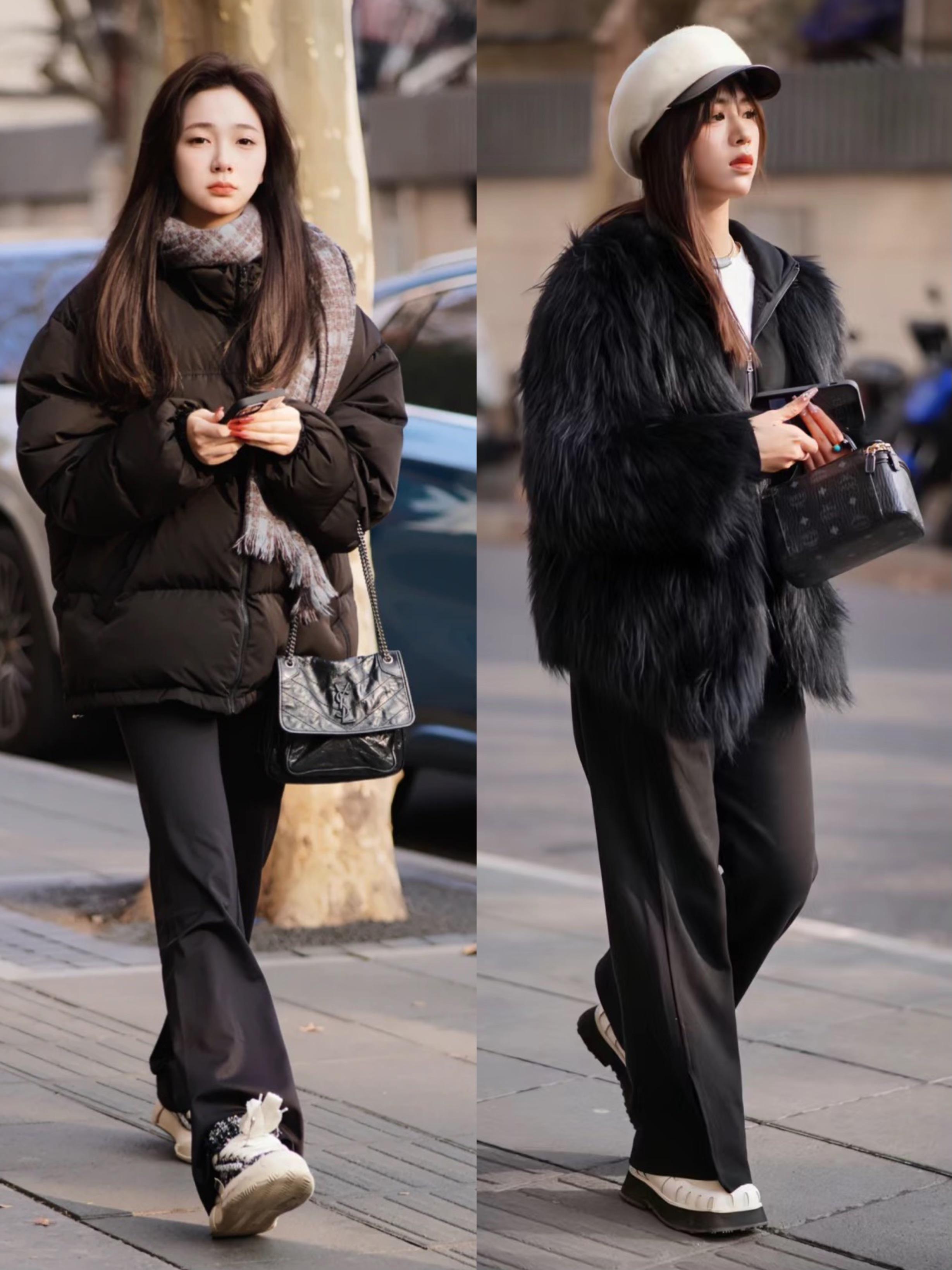 在上海街拍中,穿着短款羽絨服的時候,都更加偏愛搭配高腰的長褲。比如這一組黑色短款羽絨服+黑色高腰微喇褲的穿着方式,就保暖又體面。