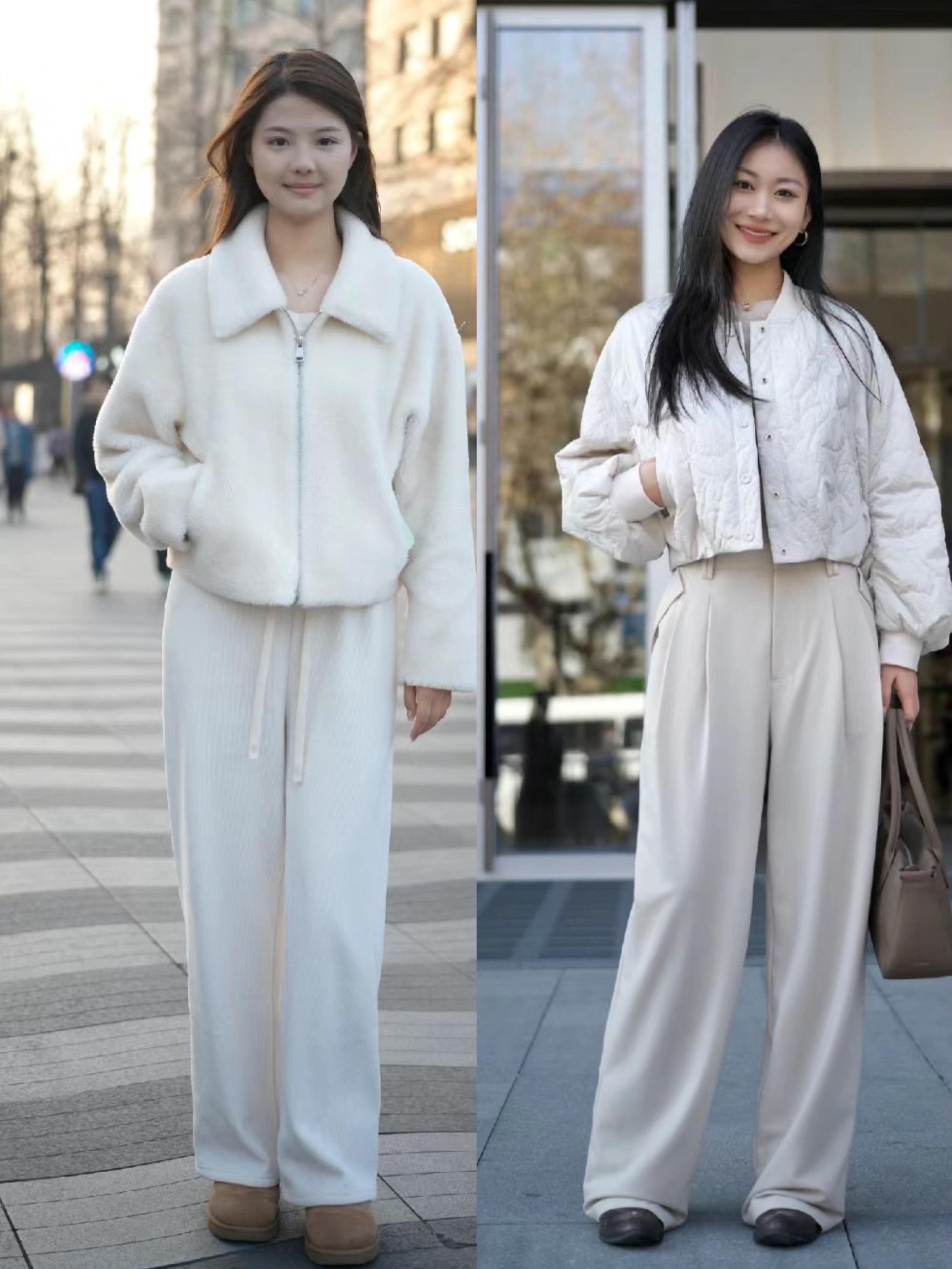 一件經典的毛絨外套,可以搭配高腰的雪尼爾闊腿褲來穿着,加絨的闊腿褲保暖性更強。整體同色系的搭配簡單清爽,這種白色毛絨外套+白色闊腿褲的組合也更加耐看。