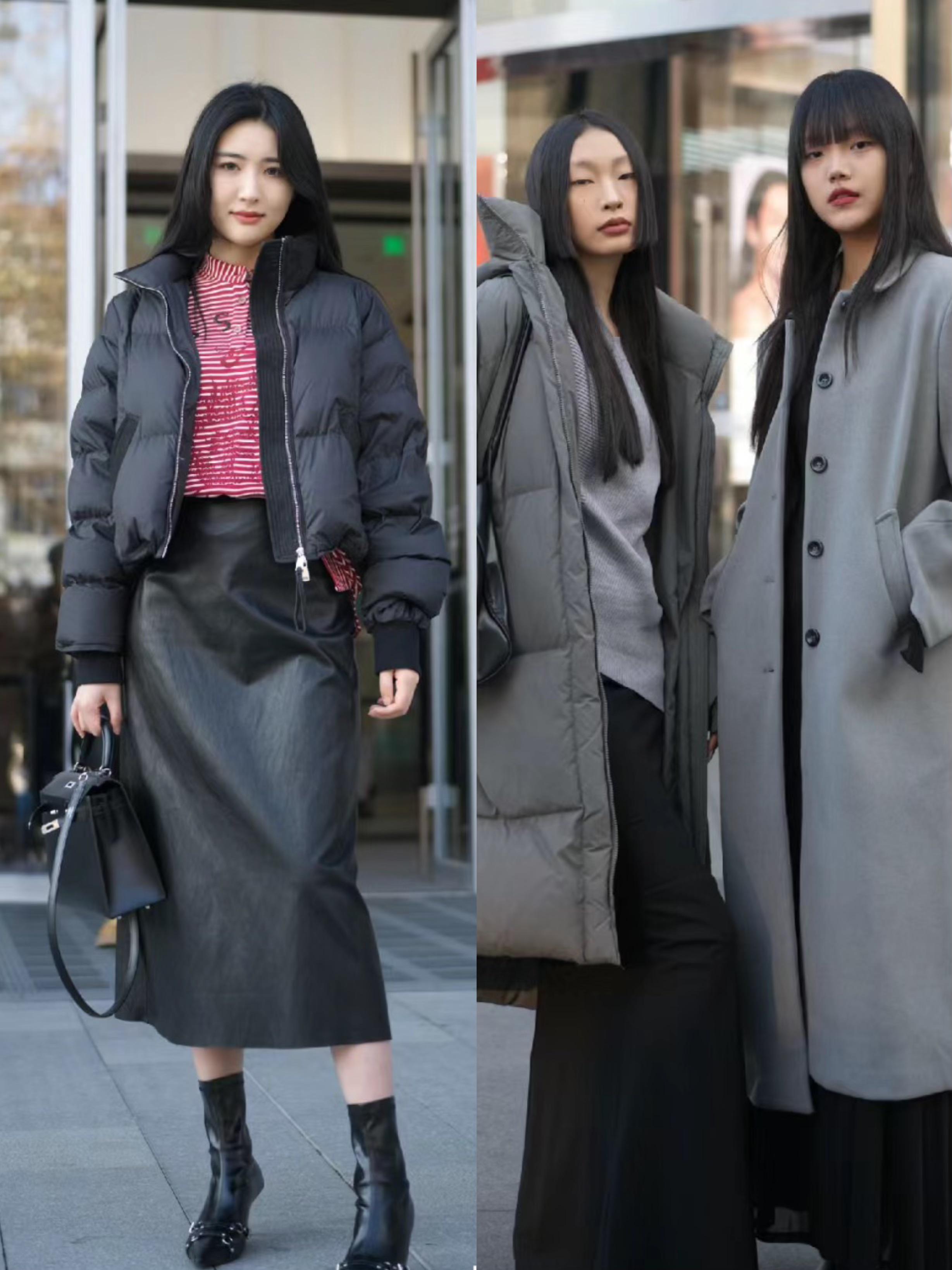 灰色系羽絨服配上經典的黑色魚尾半身裙,有一種溫婉又知性的美。魚尾半身裙腰臀部是一種自然收緊的設計,可以修飾臀部線條、更多了迷人的姿態。