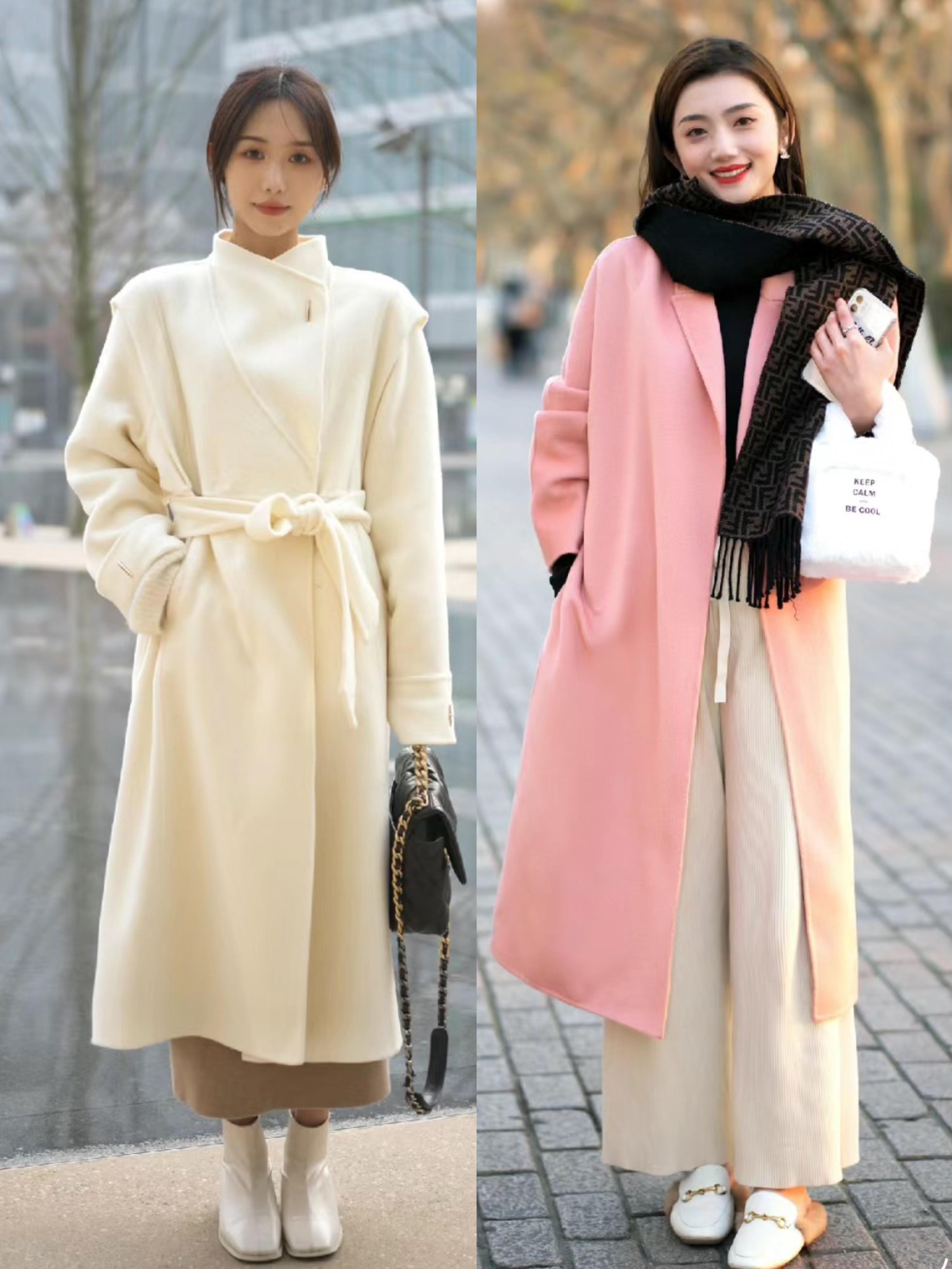 淺粉色的毛呢大衣,配上修身的打底衫、給人一種溫柔又高級的美。黑色打底衫搭配了高腰的闊腿褲,舒適體面又具備包容性,梨型身材也可以借鑑黑色打底衫+闊腿褲的組合。