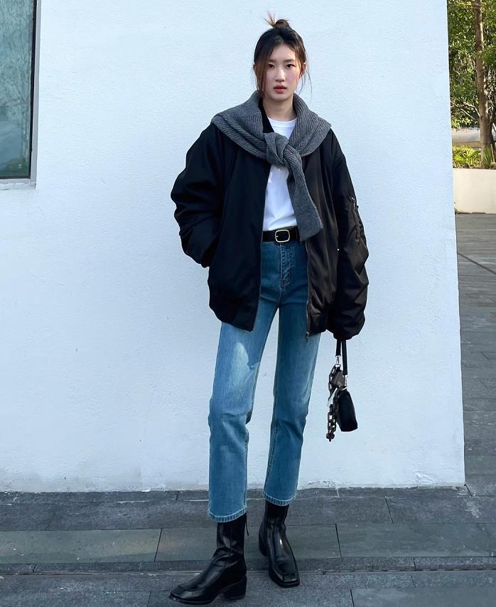 灰黑色的九分牛仔褲,挺括的褲筒,正好把纖細修長的腿型襯托出來,這個長度也是很適合小個子女生的。與粗跟短靴相配,下身的比例也被拉長了。