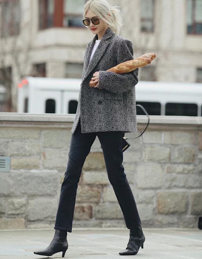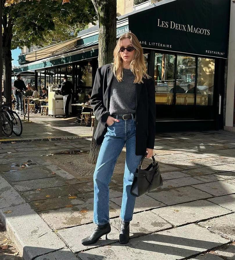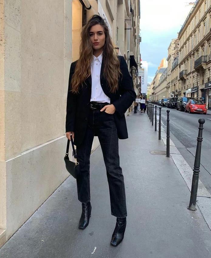 黑色西裝外套+九分牛仔褲+短靴,既可以增高又能拉長腿部線條,黑色的短靴與西裝顏色進行了呼應,和諧又時髦。