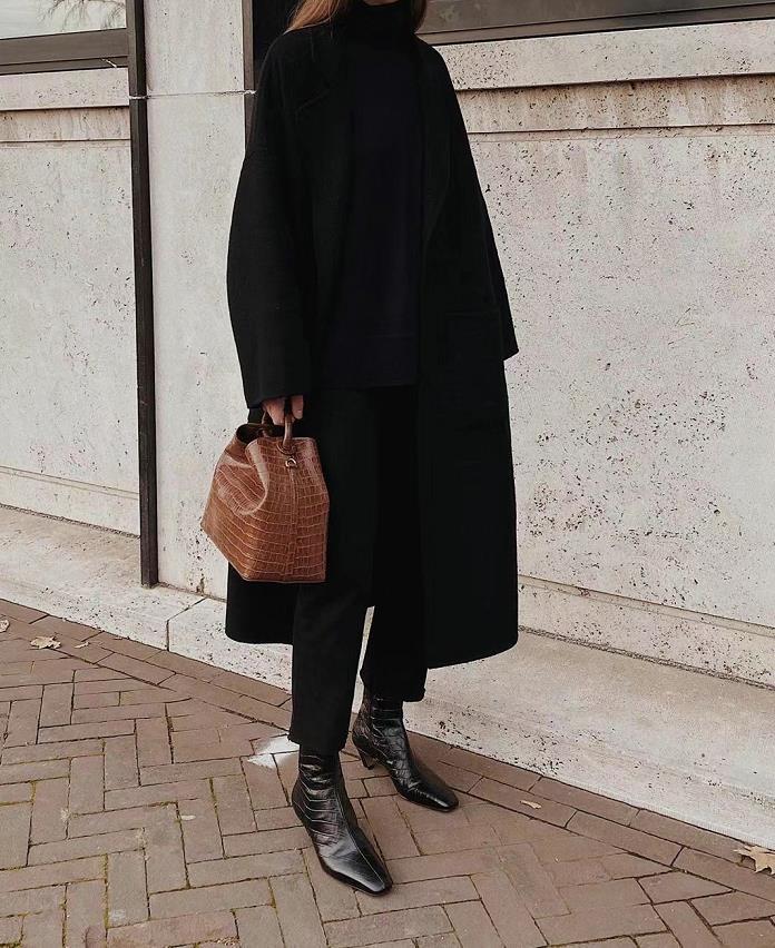 黑色九分褲和黑色短靴相配,褲靴同色,視覺上就能給人一種下身比例變修長的既視感,顯瘦又顯高挑。