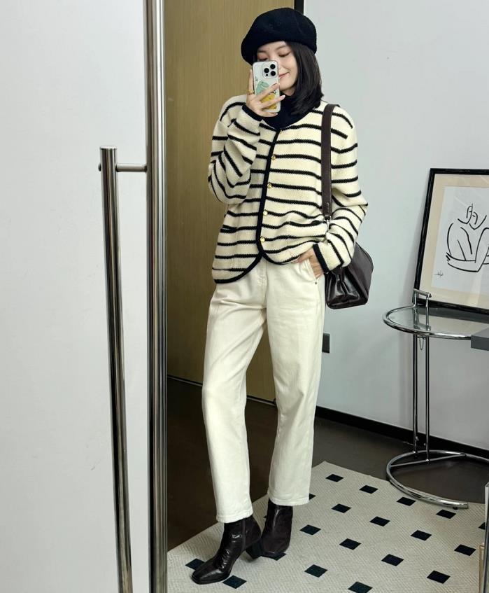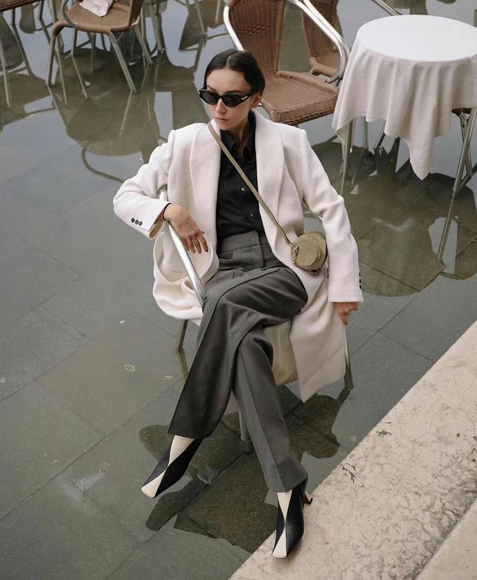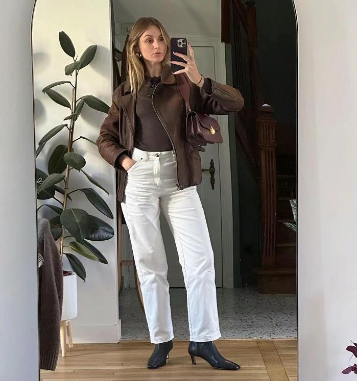 秋冬的穿搭,更偏愛美拉德風一些,想要打造這種風格的話,棕色系的單品是不可缺少的。白色九分褲和黑色短靴,且不說黑白配很般配,又不過時,光是直筒版型的褲子和九分的長度,都能讓你穿得又瘦又高了。
