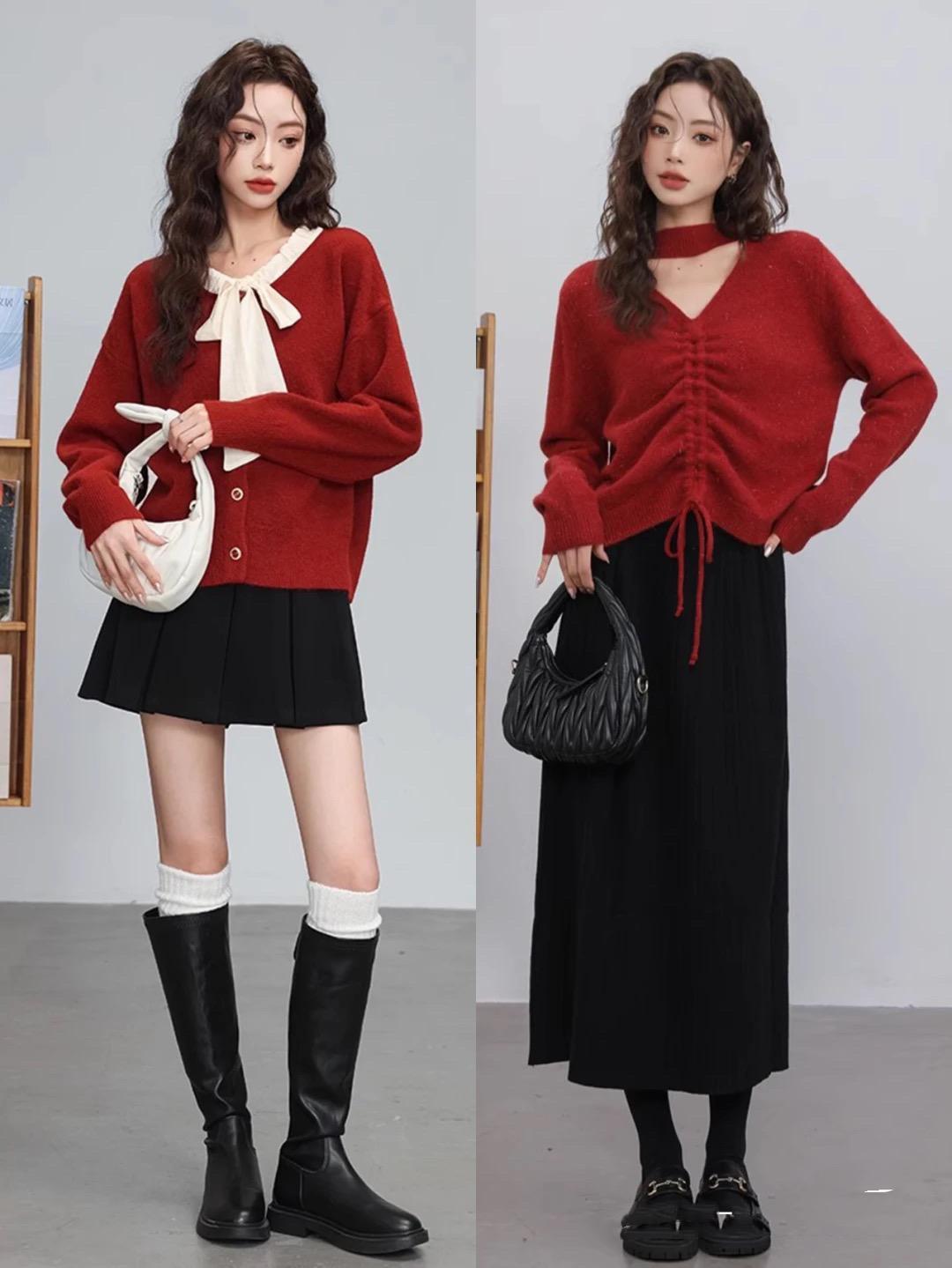 像這種櫻桃紅的毛衣,個性一點的領口也更加洋氣。想要秀長腿就選擇高腰的A字形黑色半身裙,想要溫柔雅緻的美,就搭配黑色過膝半身裙。不同的風格、也適合不一樣的人羣。