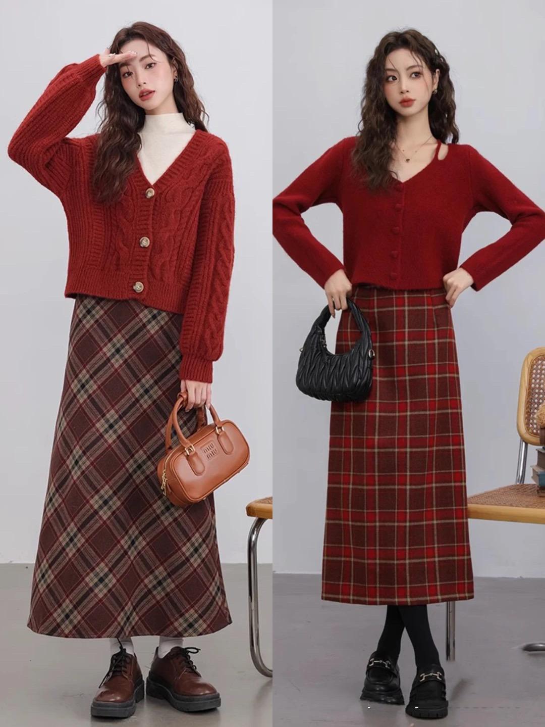 稍微帶有一定寬鬆度的紅毛衣,我們可以搭配格子半身裙來穿着。像這種高腰的A字形格子半身裙,穿起來線條感更加流暢。高腰線的款式,對於小個子更友好。