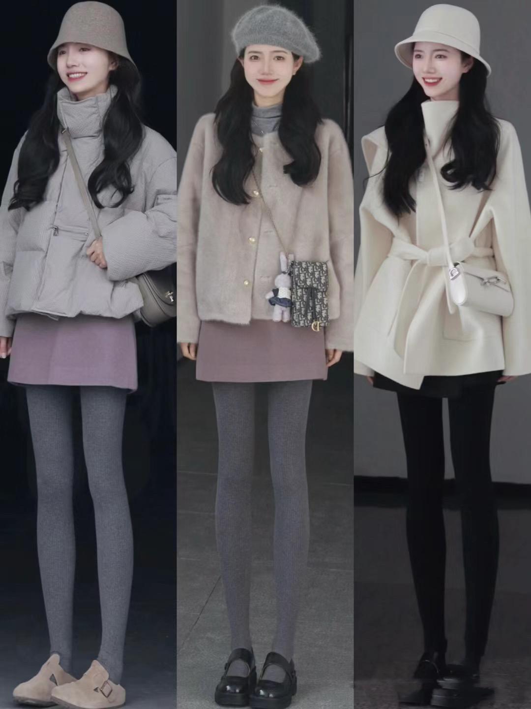 短款的毛呢半身裙,搭配修身的打底褲來穿着,還可以顯得雙腿又細又直。穿這種超短裙的時候,要參考自己的腿型,腿型比較筆直的話,是可以更輕鬆的駕馭這種短外套+毛呢半身裙的組合的。