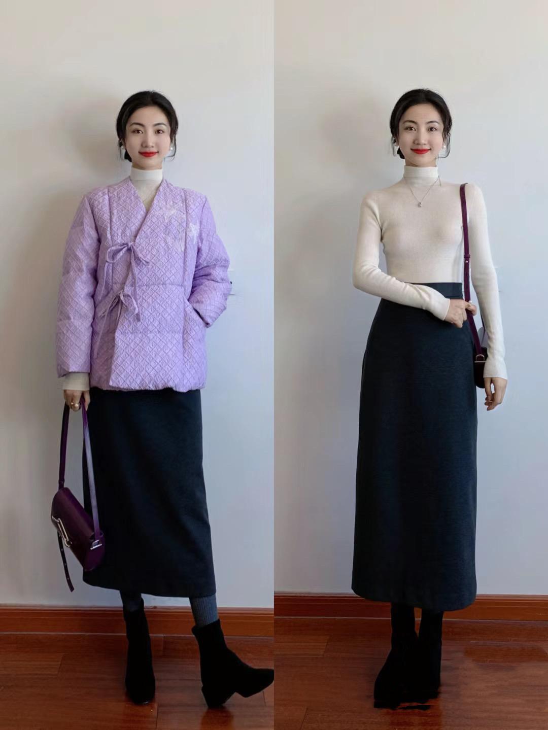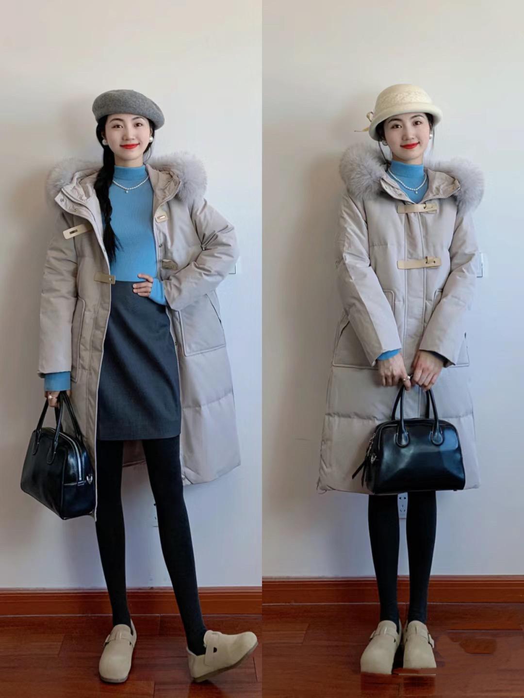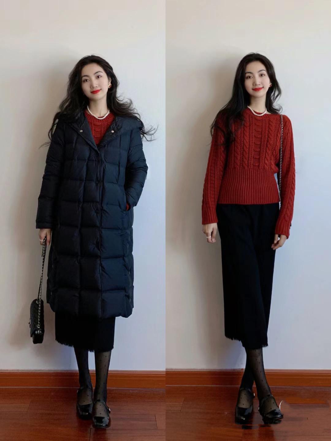 如果新年到時候溫度比較低,我們還是需要穿得更加厚重一點。比如修身的打底衫可以搭配高腰的半身裙,再搭配一件厚實的羽絨服防風又保暖。