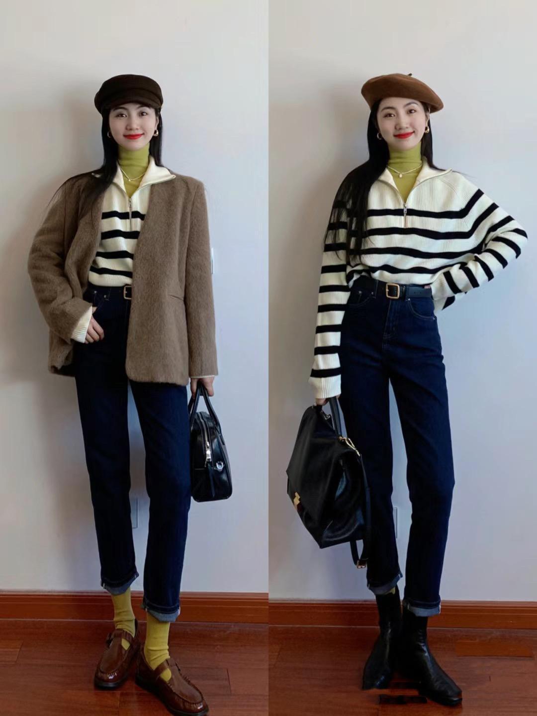 半拉鍊的毛衣,可以選擇經典的條紋元素,黑白造型的半拉鍊毛衣穿起來舒適度更強。搬來連毛衣疊搭半高領打底衫,露出V形領口更加時尚。