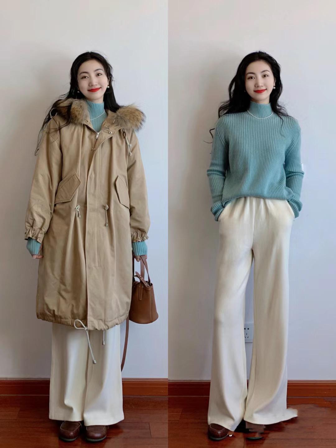 一件豎形坑條的毛衣,防皺又耐穿,也特別容易打理。用淺藍色毛衣配白色闊腿褲,簡單清爽,作爲新年穿搭俏皮減齡還特別的顯白。
