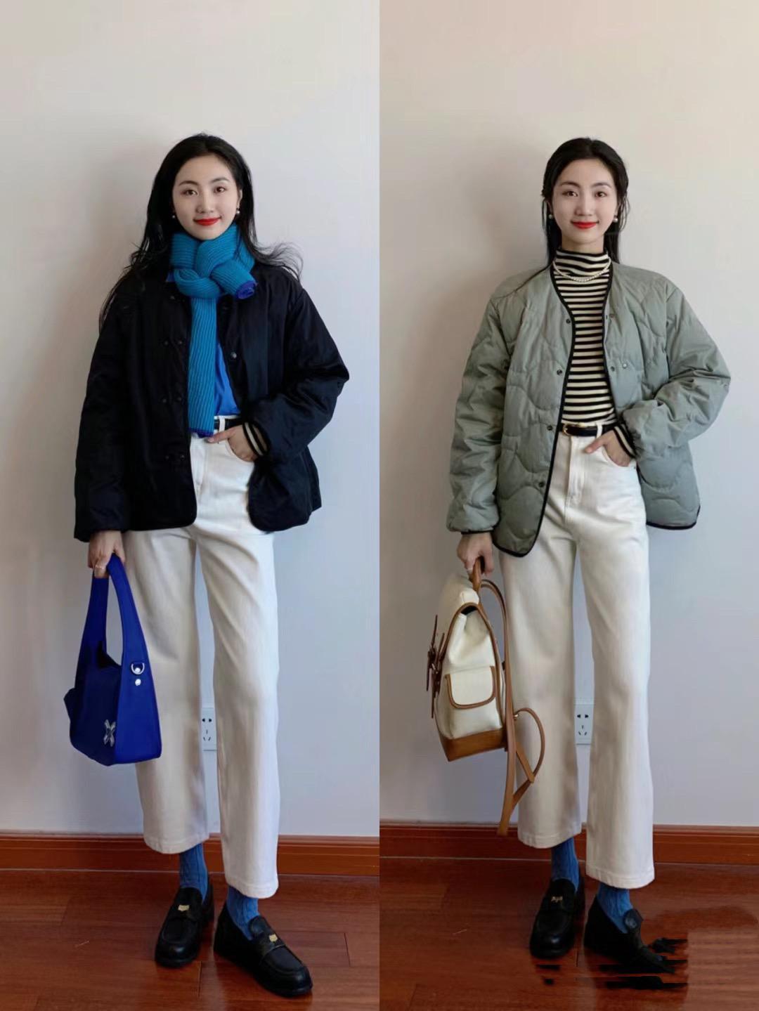 冬天裏想要把自己打扮的利索一點,大概是小個子的夢想吧。如果你的個子不高,可以借鑑這一組穿搭模板。短款的絎縫棉服,配直筒的白色牛仔褲、清爽又利落。