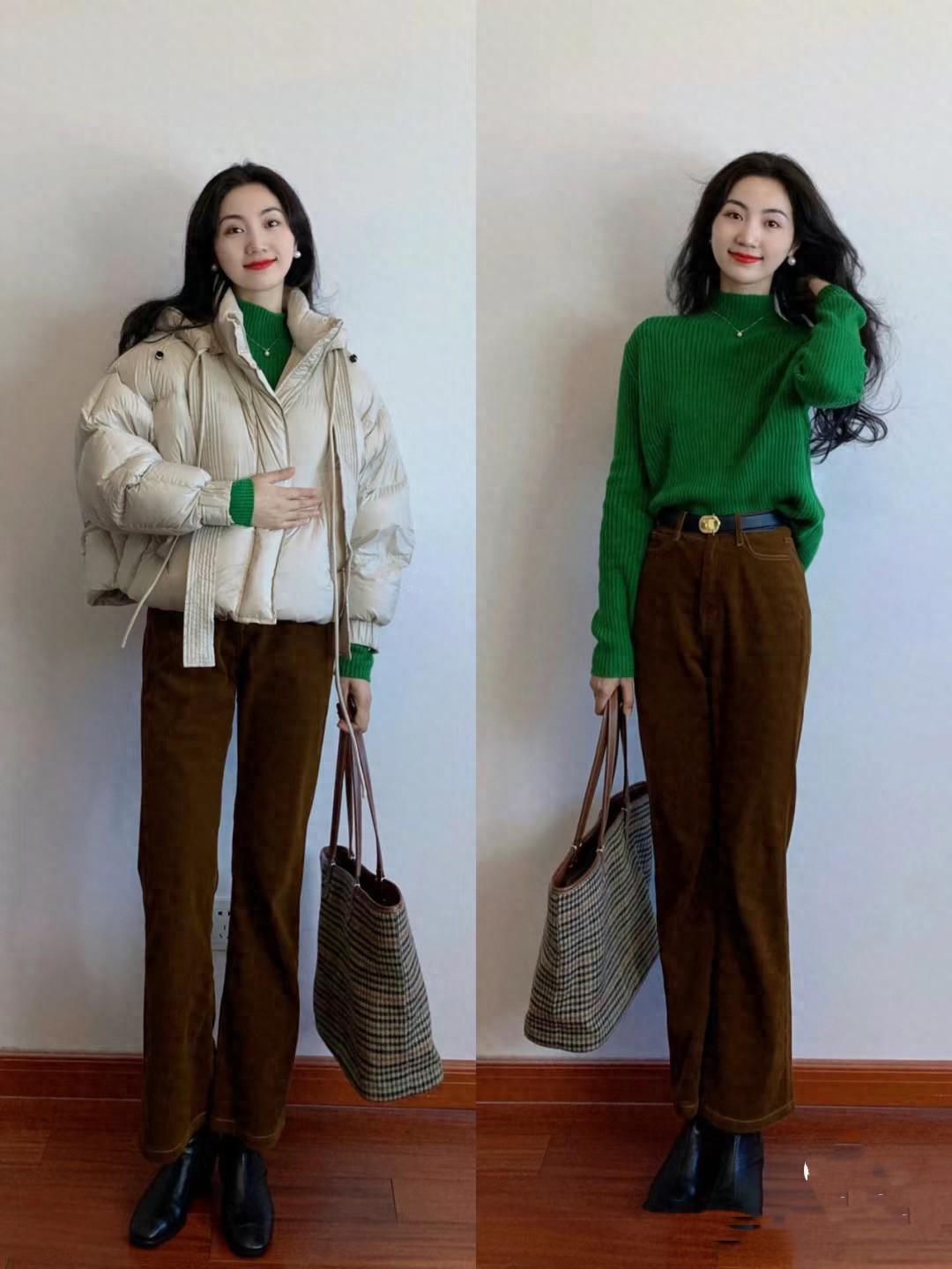 像這種寬鬆的綠色系毛衣,我們可以搭配高腰的闊腿褲來穿着。條絨面料的闊腿褲,穿起來更加時尚大方。用綠色毛衣配棕色闊腿褲,可以復古可以時尚,風格更多變。
