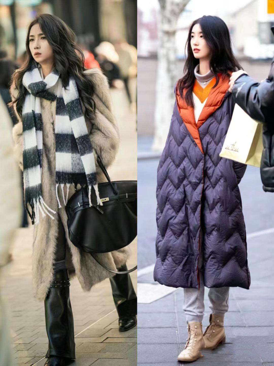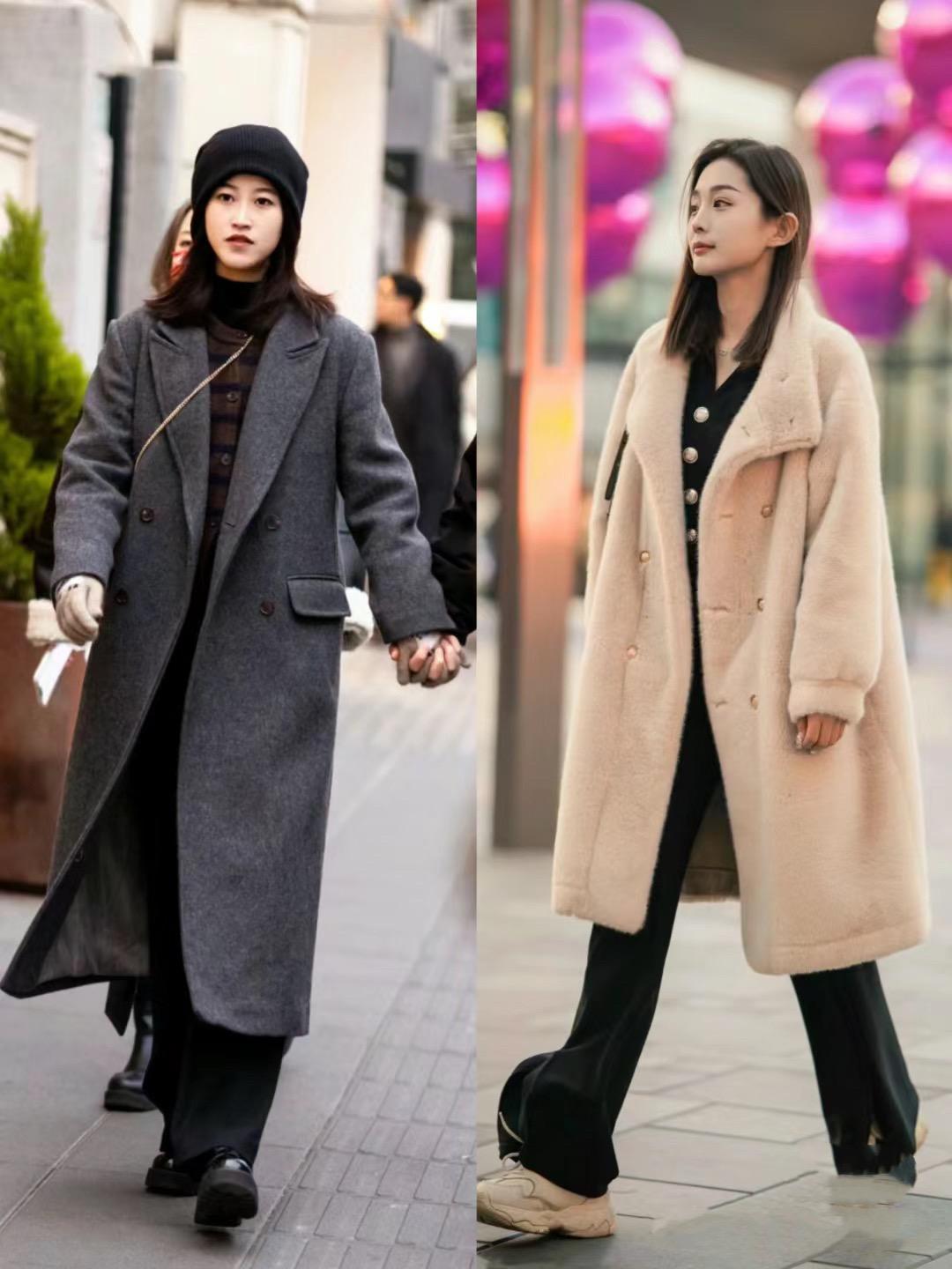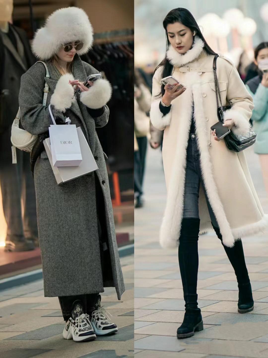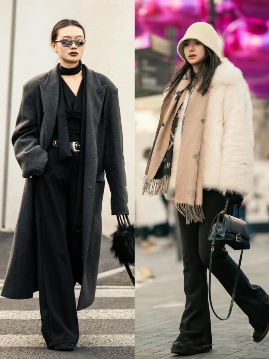 冬天裏穿大衣,儘量不要搭配打底褲了,很容易暴露腿型、也可能顯得土氣。一條直筒的黑色皮褲,搭配皮草大衣又貴又酷、真的很惹眼。
