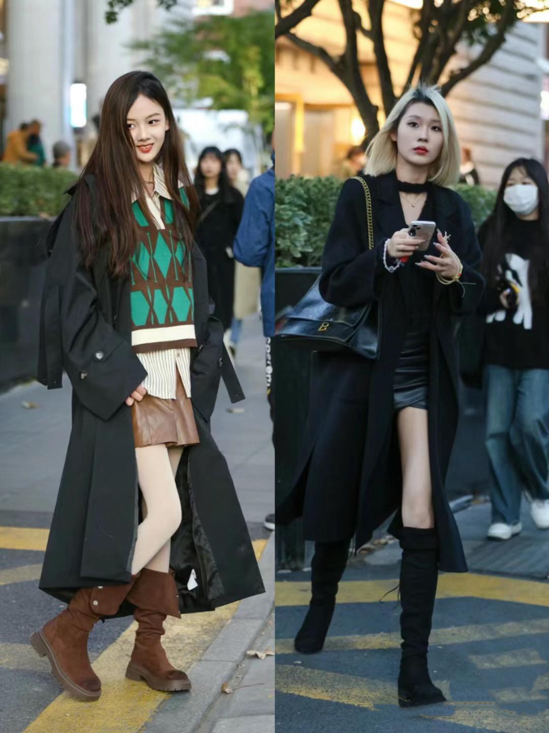 我們穿麂皮長靴的時候,可以搭配牛仔褲、也可以搭配短裙。用長款的黑色大衣,來搭配厚底的麂皮長靴,有一種時髦又性感的美,配短裙露出雙腿線條、更多了輕盈美。
