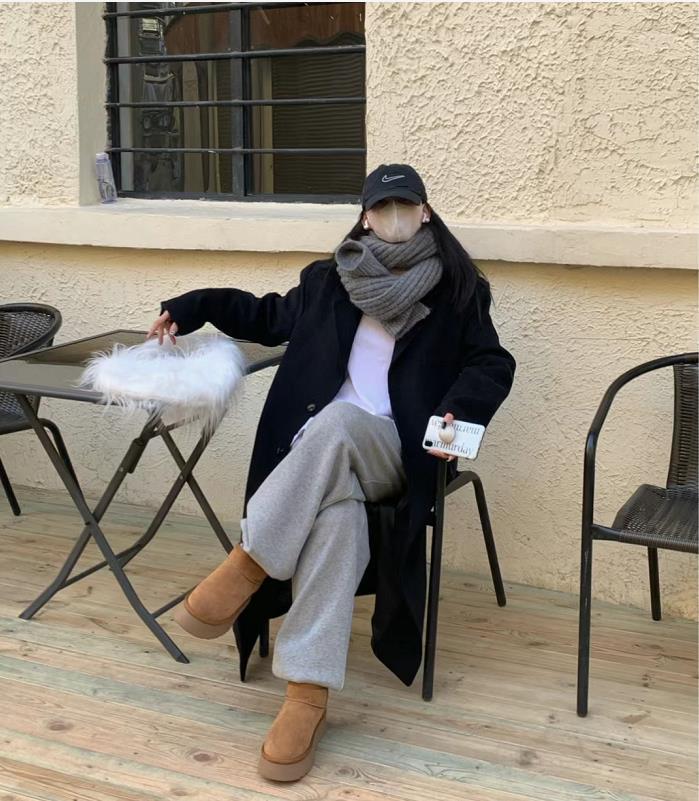 拜託,這樣穿也太有韓範氣息了吧?喜歡這種休閒舒適又很減齡的穿法,黑色大衣+灰色運動褲+雪地靴,保暖又時髦。