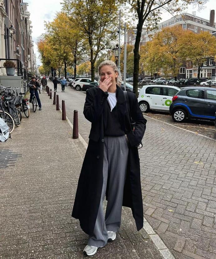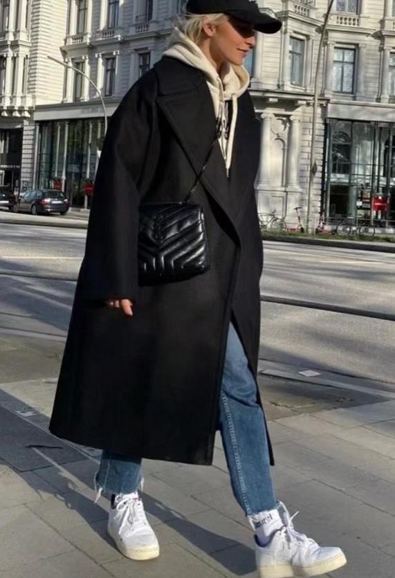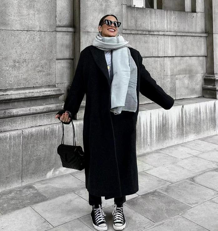黑色大衣這件那麼顯沉悶的外套,該選什麼褲子和鞋子來配呢?沒有什麼比牛仔褲和運動鞋來得更百搭友好了。這樣的穿法看起來可休閒舒適了。