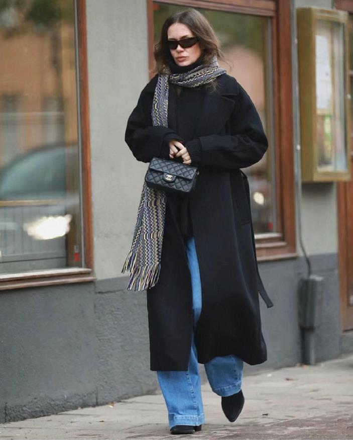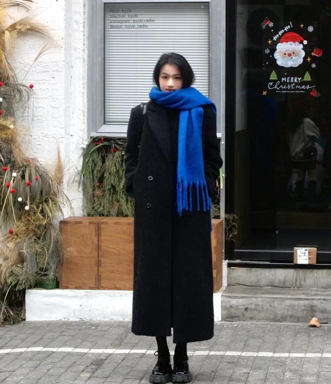 黑色大衣和藍色圍巾的組合,真的將氛圍感直接拉滿了,流蘇長款藍色圍巾,隨意搭在脖子上,增加了隨性和美感。