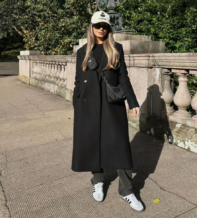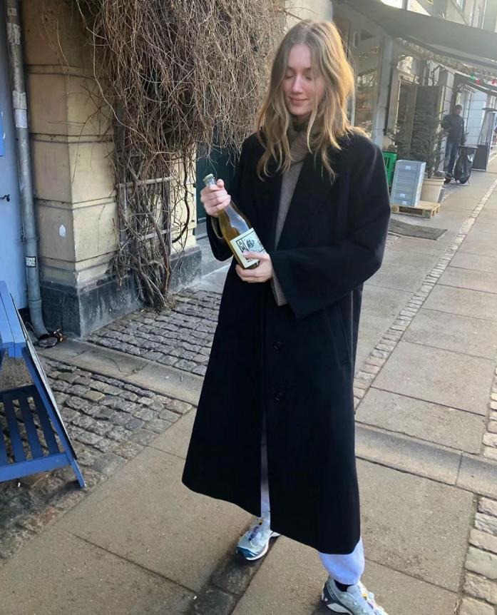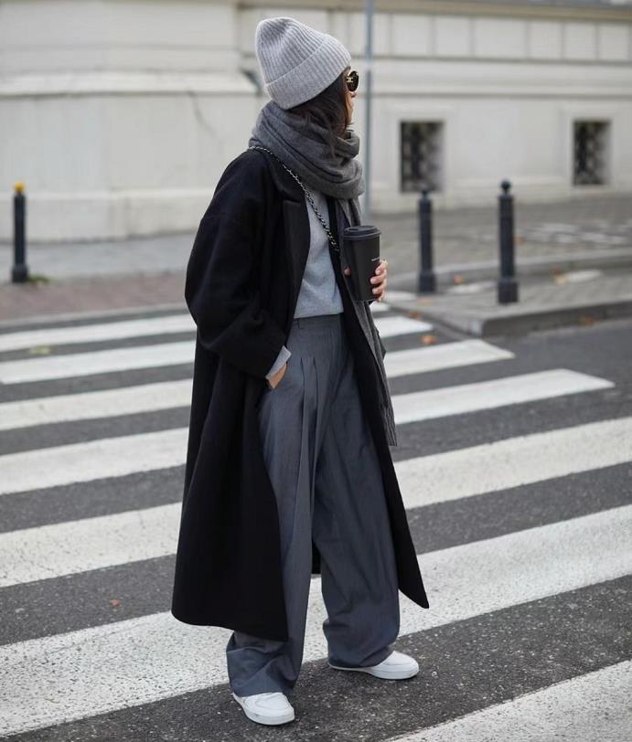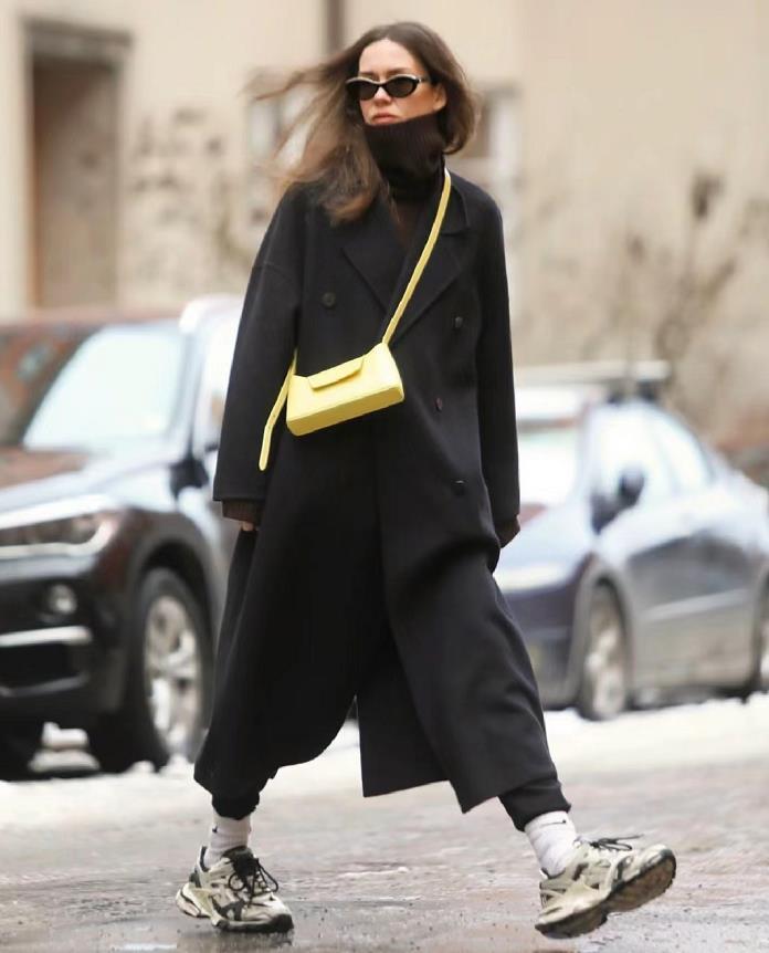 黑色大衣+運動褲+運動鞋,因爲褲子和鞋子的加入,讓原本沉悶的黑色大衣多了幾分休閒與活力。