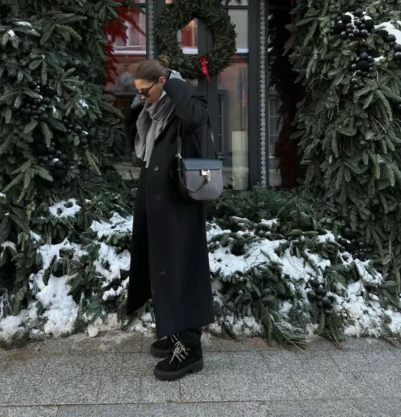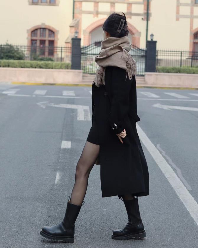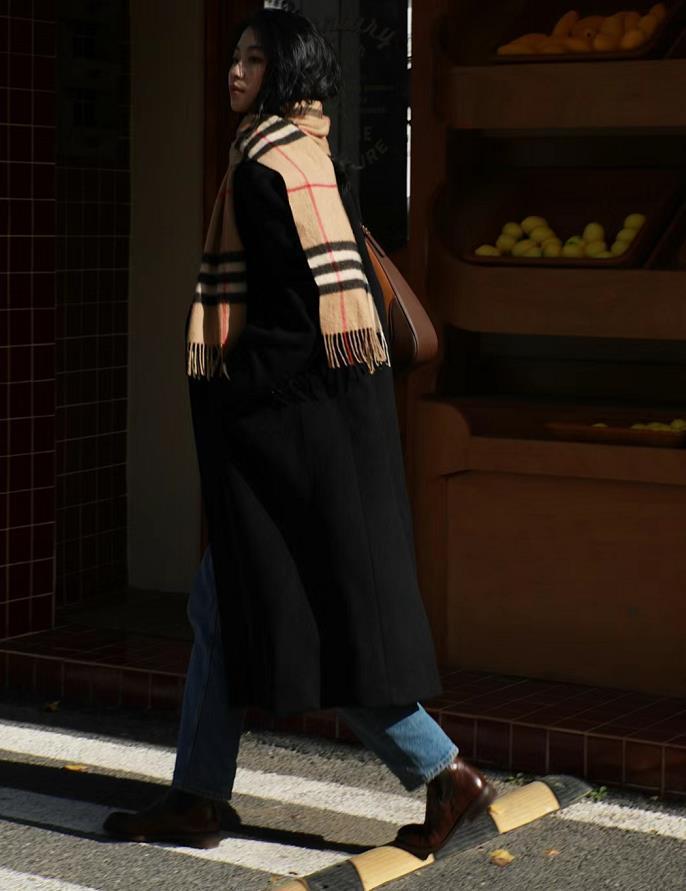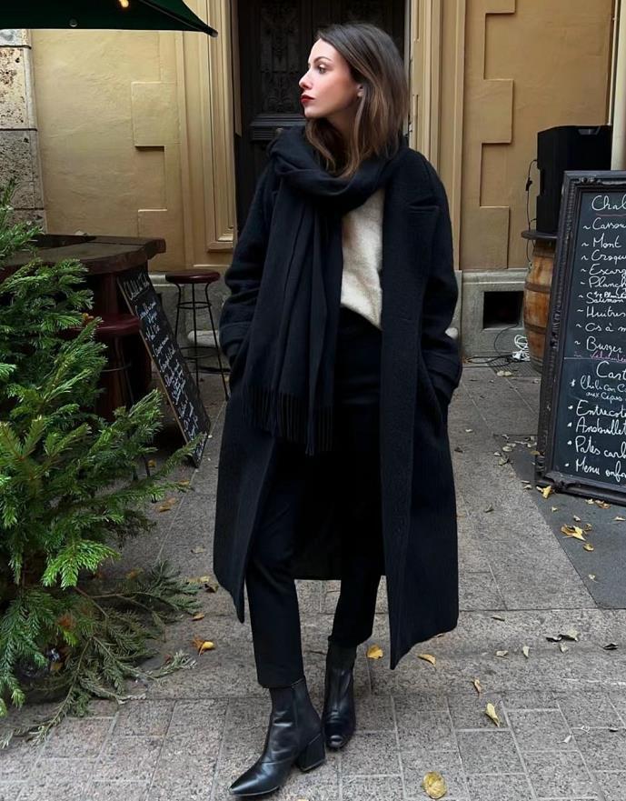 一身黑色也可以很高級,但爲了減少其帶來的沉悶感,可以適當增加些配飾來點綴,例如圍巾。咖棕的格紋圍巾,與黑色大衣真的很配哦。