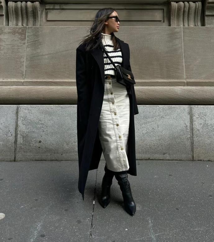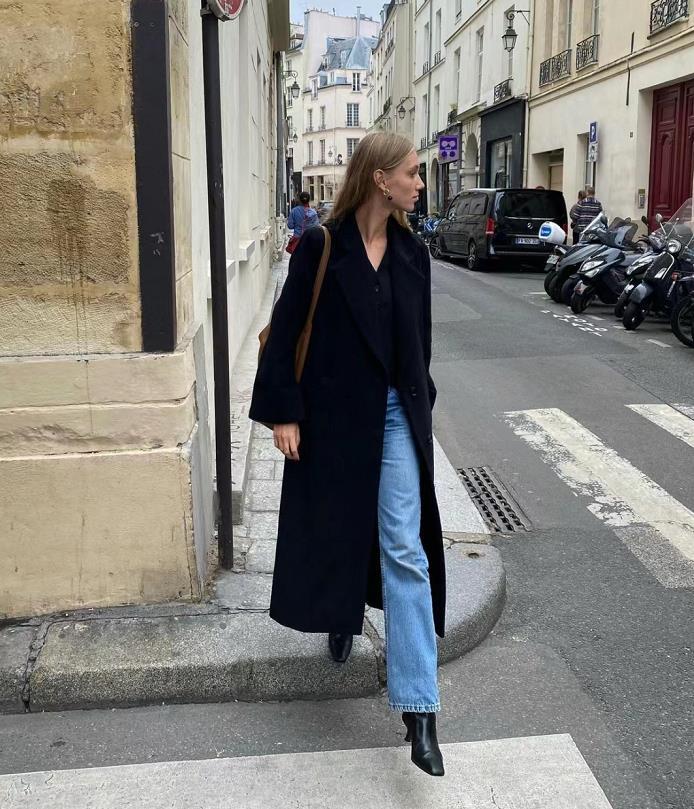 像黑色大衣這種經典款,怎麼搭配纔好看呢?最簡單直接的方式就是選牛仔褲來配了。特別是九分直筒牛仔褲,加上粗跟短靴後,不僅顯氣場還不失優雅,顯瘦顯腿長。