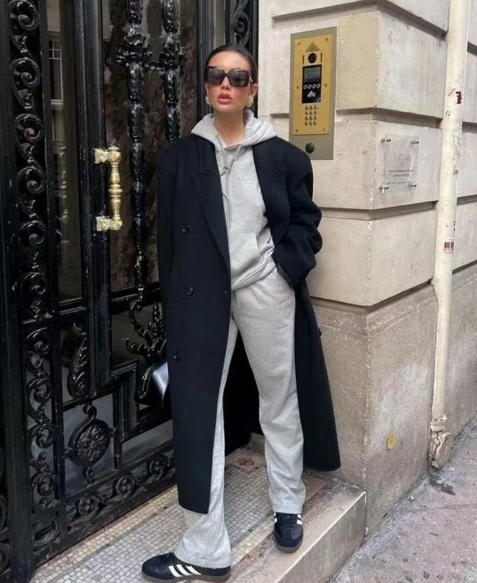 黑色大衣+運動套裝,這種穿法就比較適合懶人,以及不懂搭配的姐妹們,黑色+灰色,這樣的配色組合是很不出錯的,也耐看。
