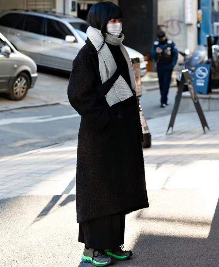 灰色圍巾進行點綴,與黑色大衣真的超般配。