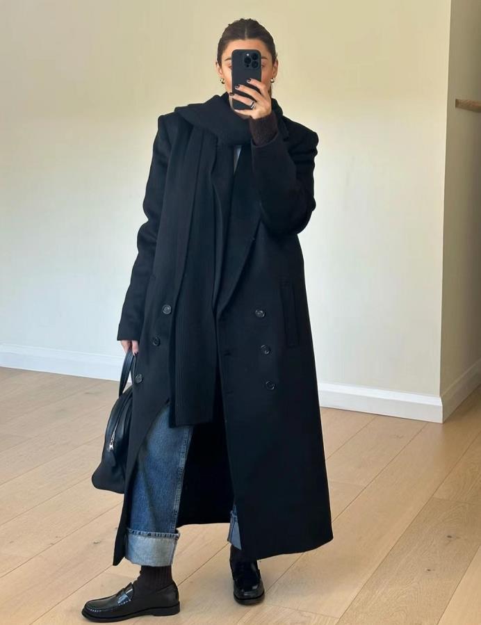 說真的,黑色大衣真的非常經典,版型超正的黑色大衣,搭配牛仔褲和樂福鞋來配,舒適自在又好看。黑色的圍巾點綴,與大衣顏色進行了呼應,和諧極了。