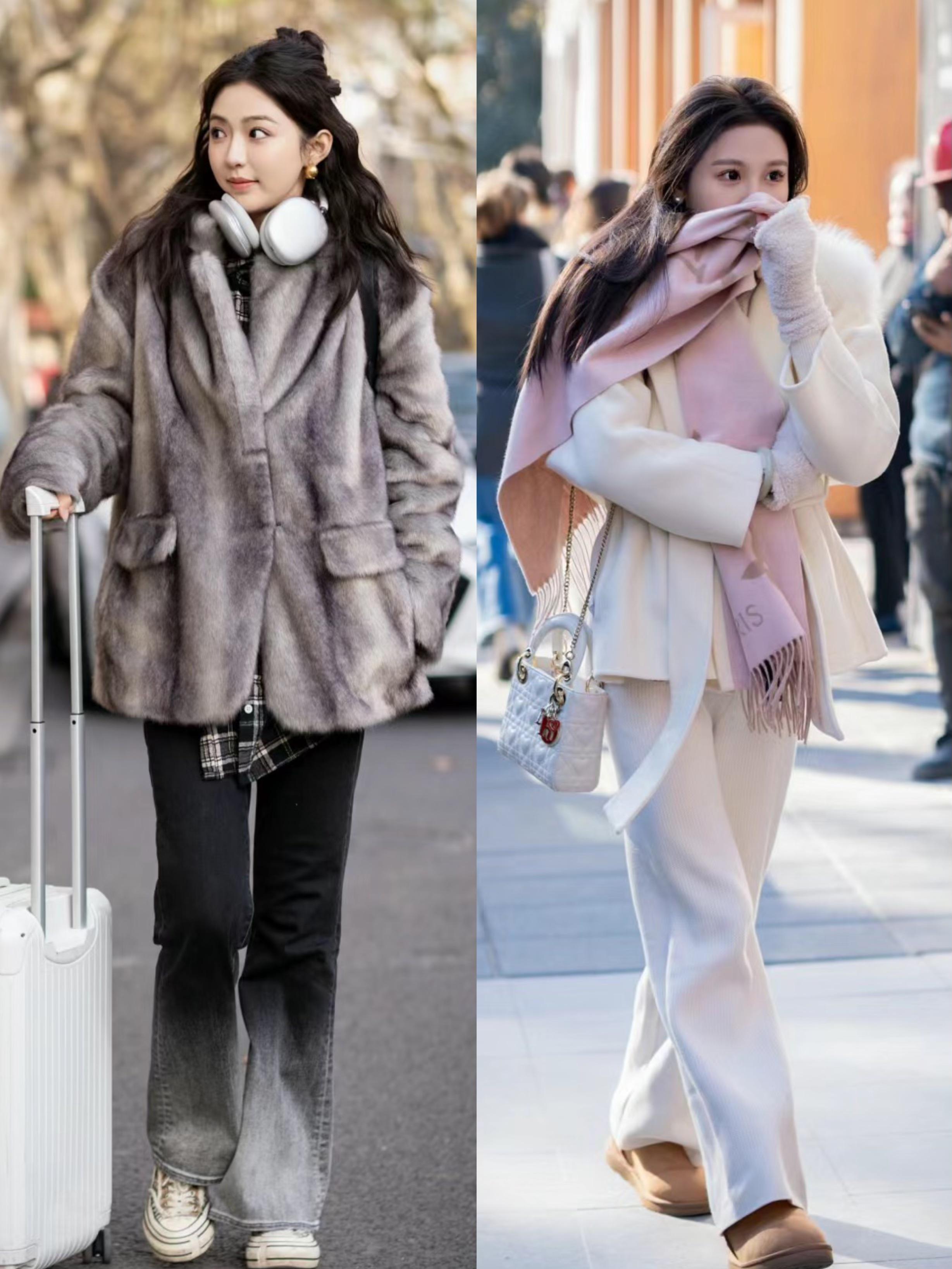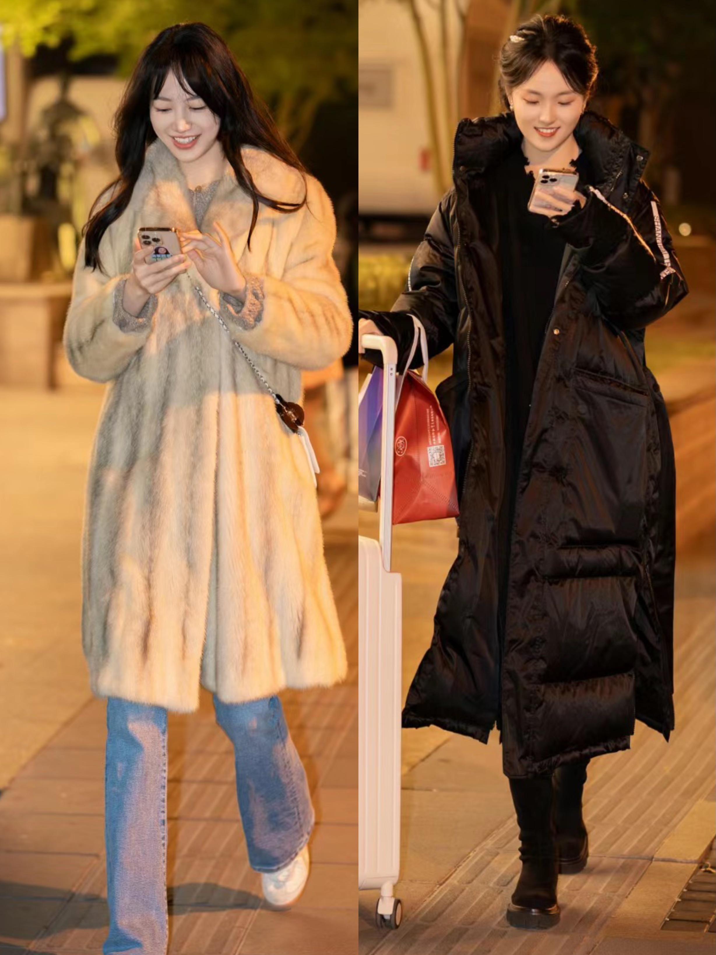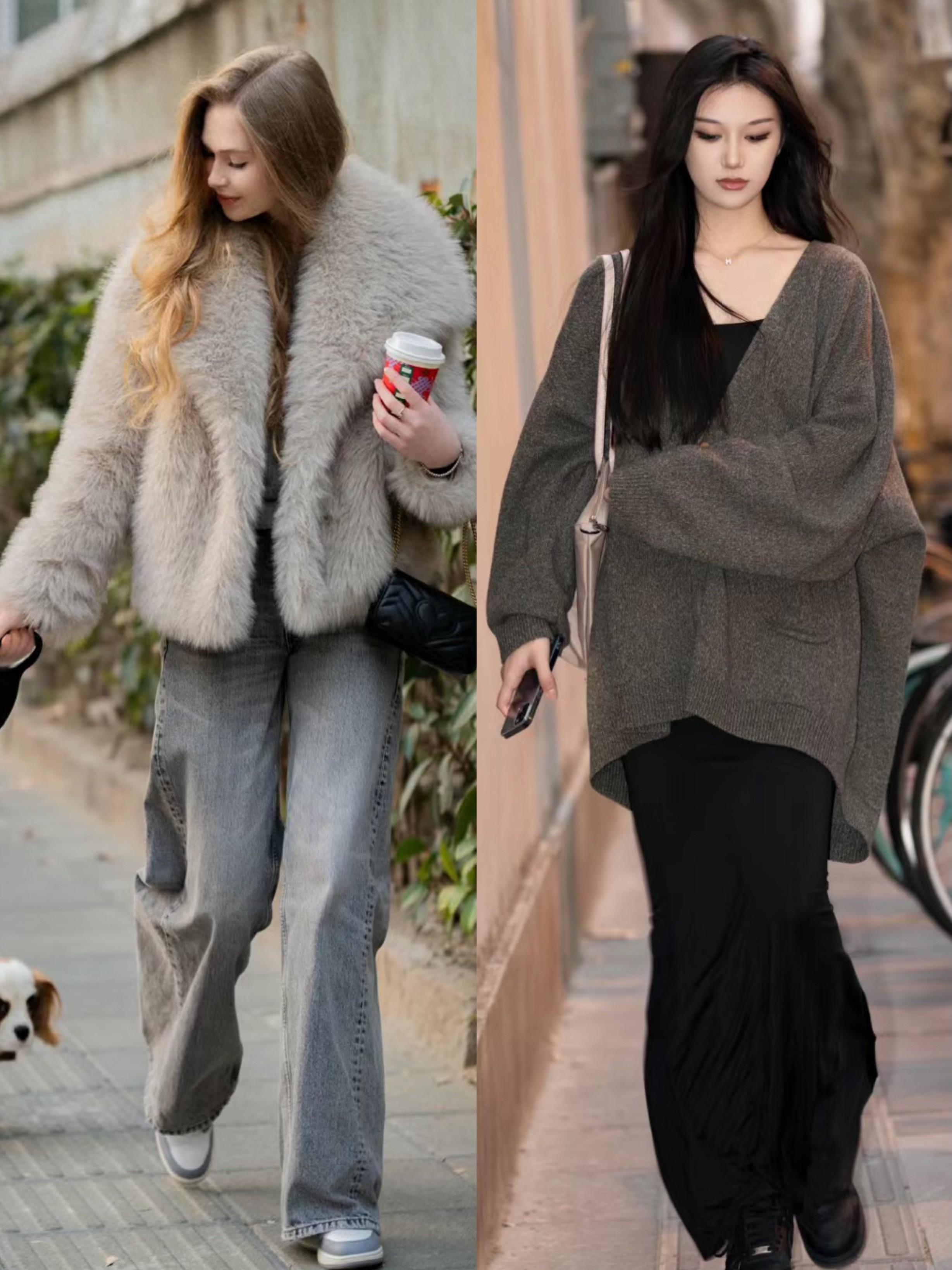 長款的皮草外套或者羽絨服外套,保暖效果是更強的。這種長款外套如果相對比較厚重的話,我們可以搭配比較修身的內搭。