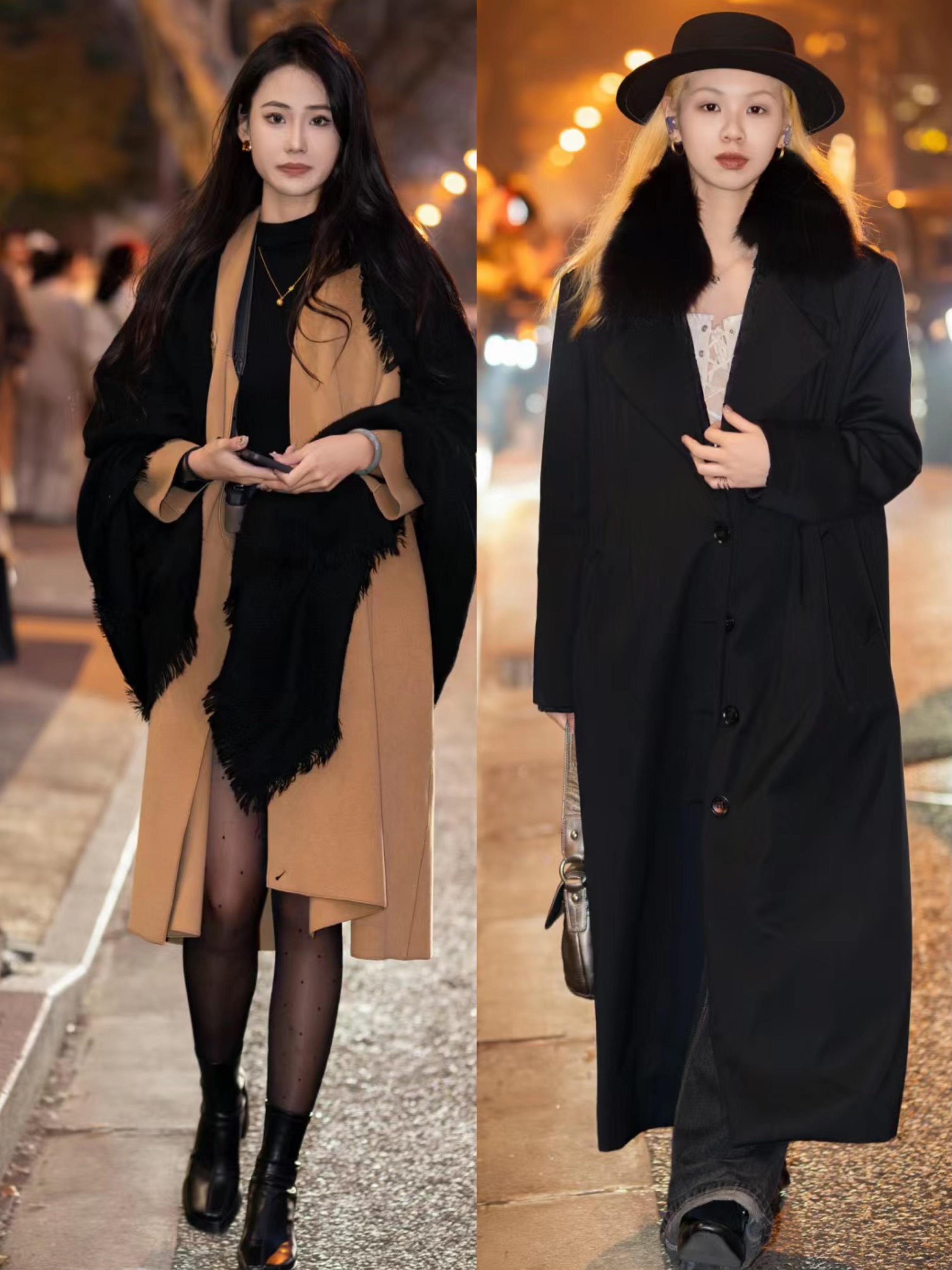 上海街拍中,黑色大衣也是非常經典的單品。稍微寬鬆的黑色大衣,搭配修身的打底衫,有一種溫柔又體面的美。配寬鬆的牛仔闊腿褲,大方又拉風。