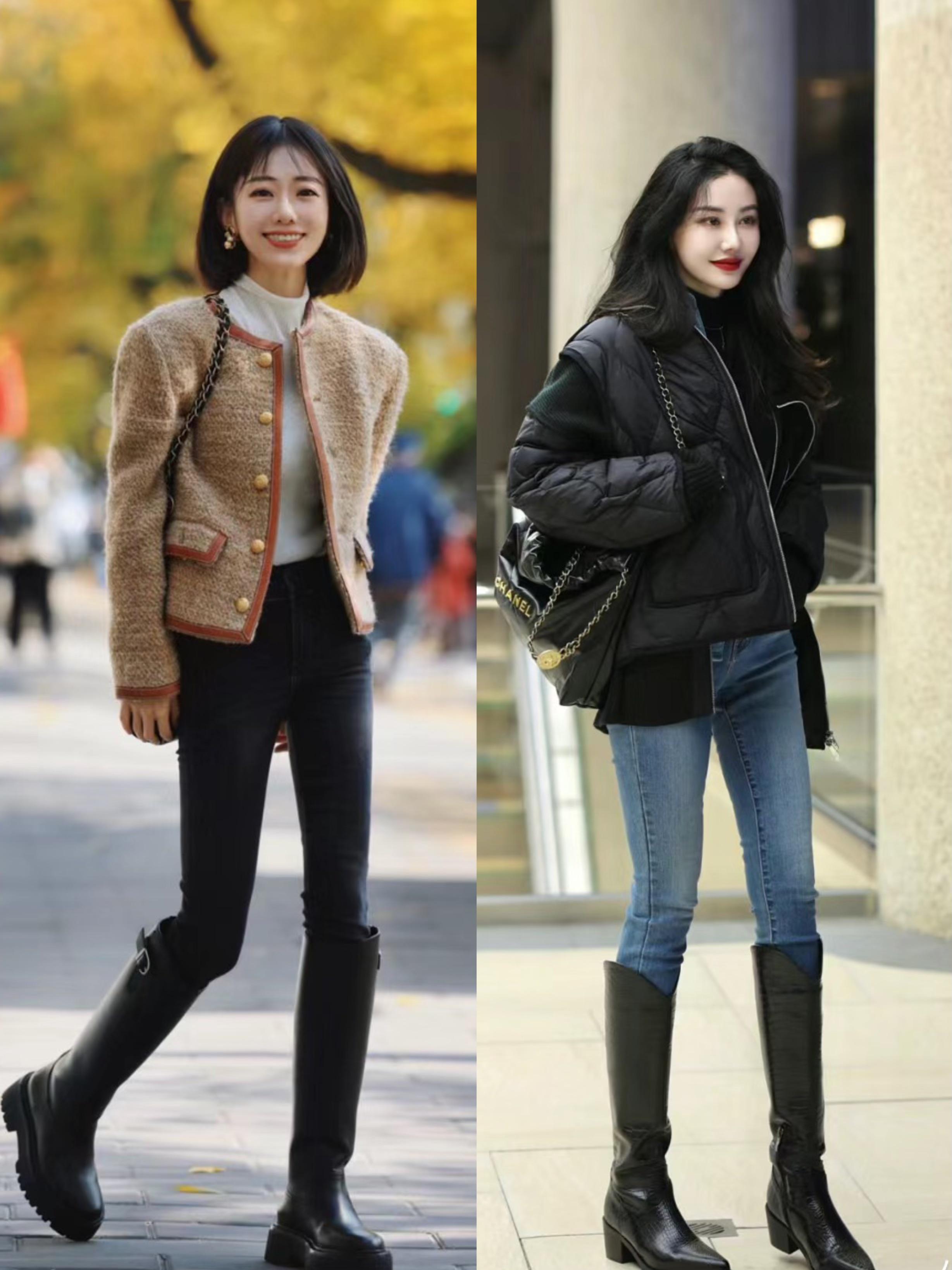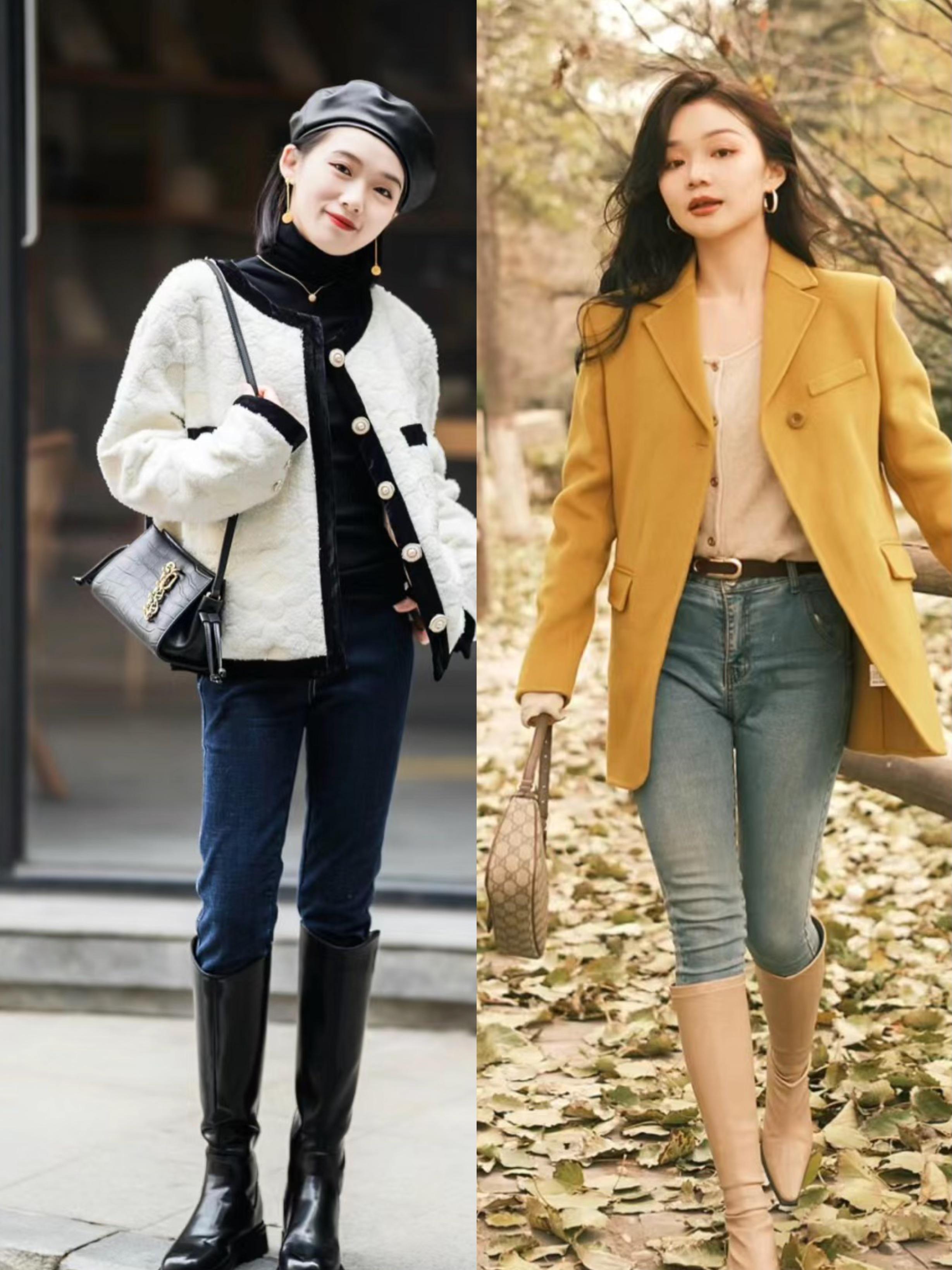 修身的牛仔褲配上尖頭的長筒靴,更多了幾分帥酷惹眼的美。日常的搭配中牛仔褲+長筒靴也是經典組合,外出的話披一件夾克風外套就很酷很美。