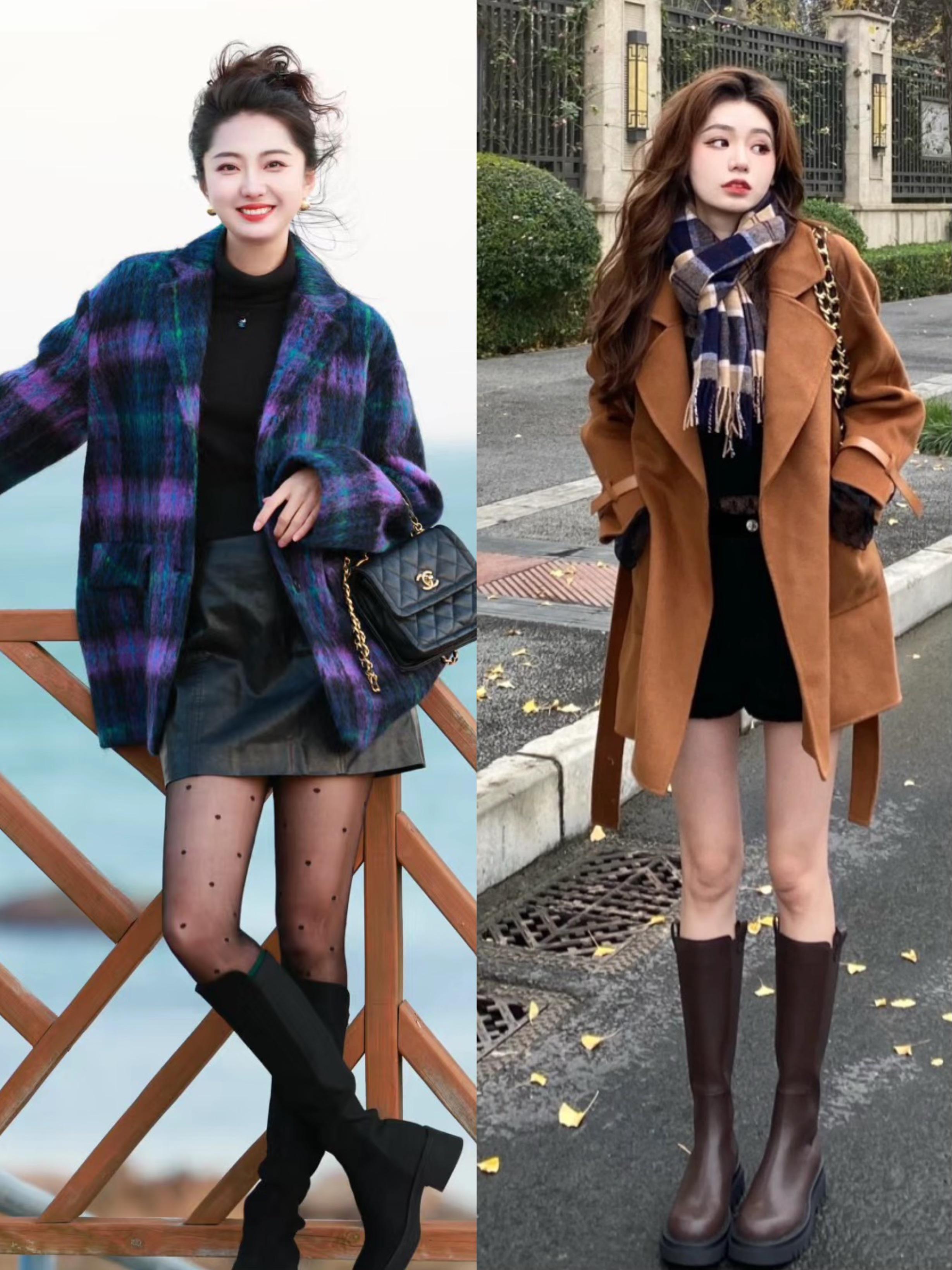短款的半身裙,穿起來時髦洋氣還不會壓個子。用短款的半身裙配厚底的長筒靴,可以顯得我們各自更加高挑。外出的話,配大衣或者羽絨服都足夠保暖。