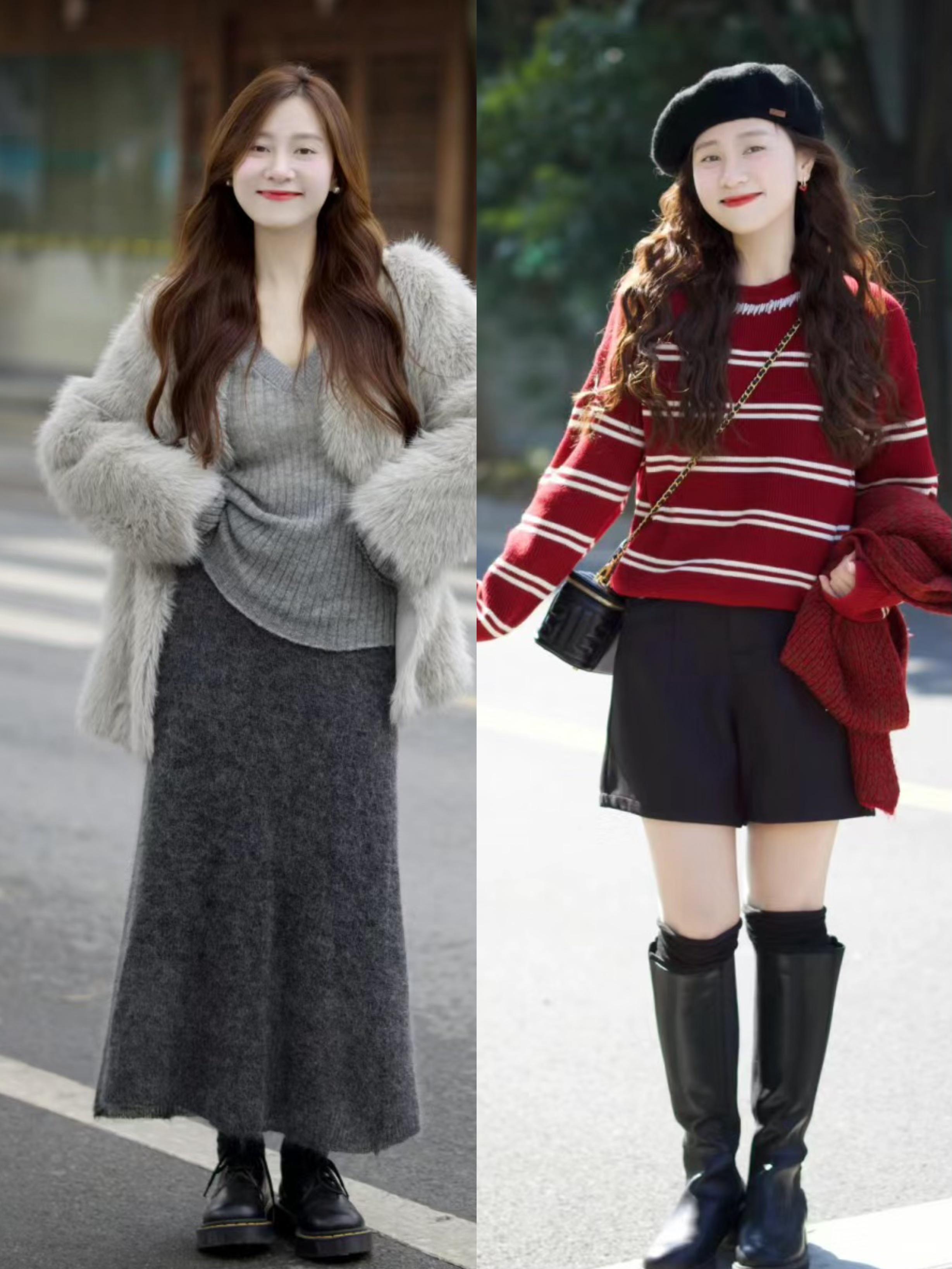 想要甜美一點,還可以選擇用紅色系的毛衣來凹造型也。紅白條紋的毛衣,不僅可以搭配短裙還可以搭配短褲,配一雙及膝的長靴,整體風格清爽又大方。