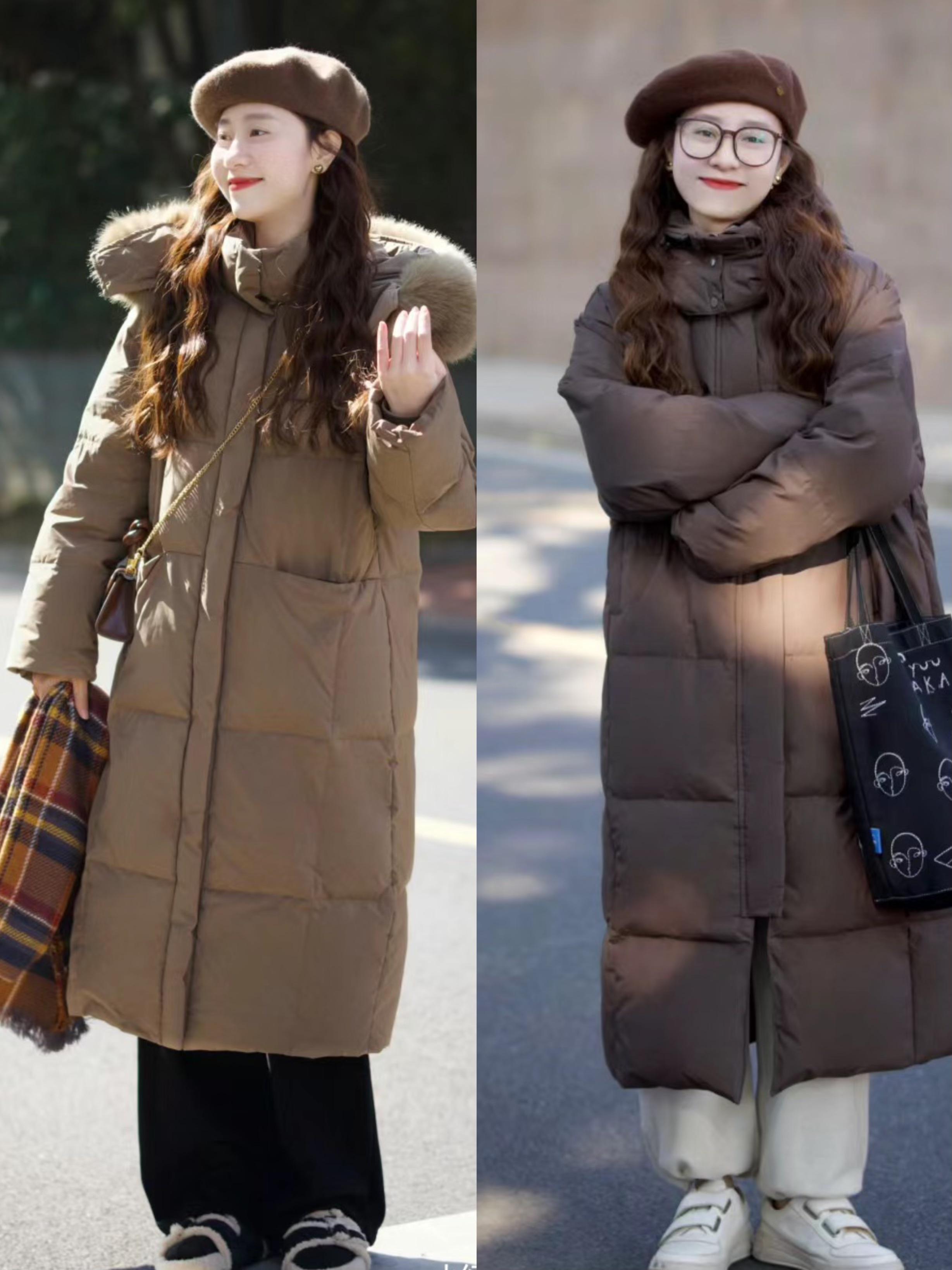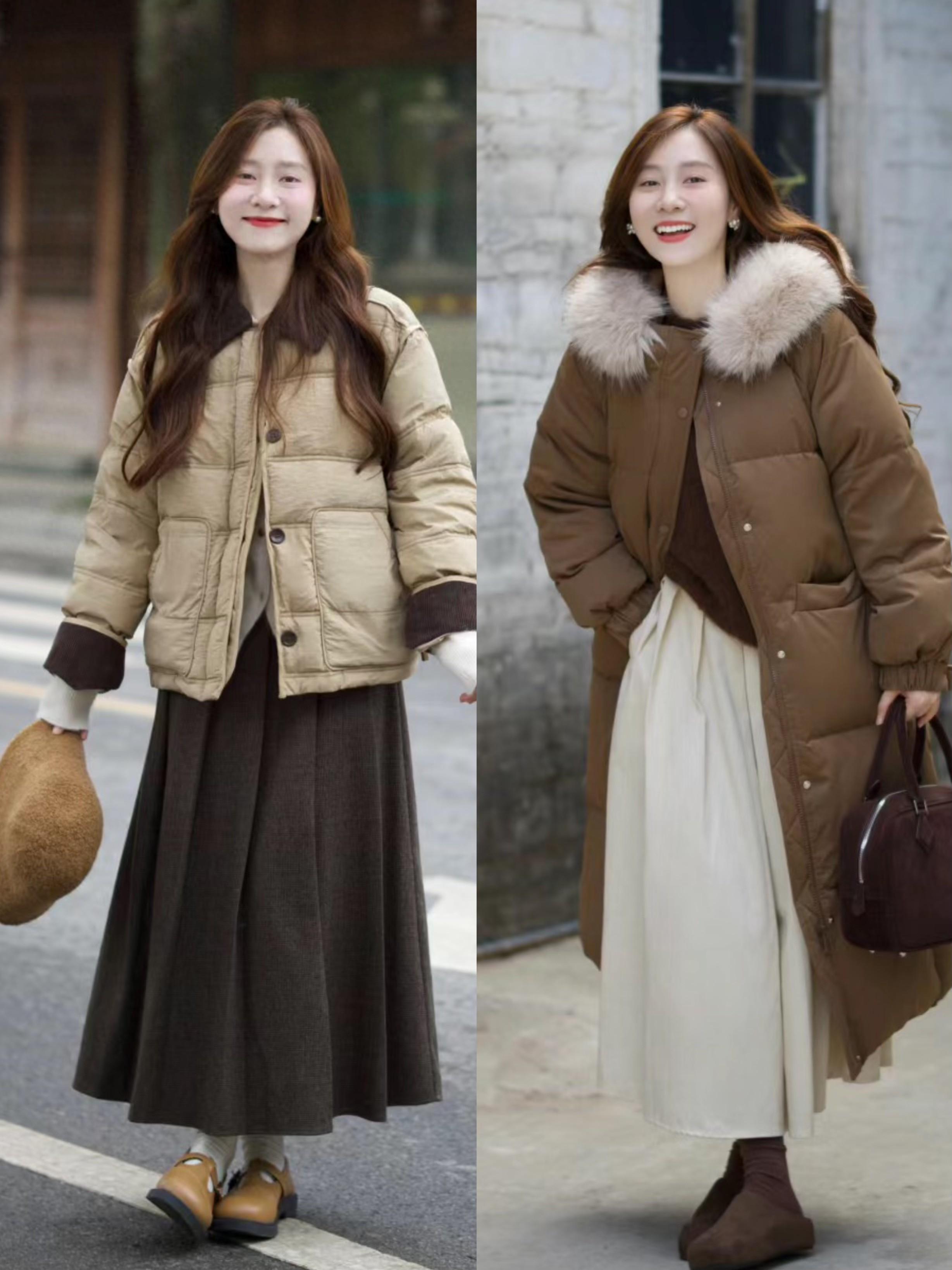 用淺棕色的羽絨服,配棕色的百褶半身裙。或者棕色羽絨服配焦糖色的打底衫,都有一種溫柔又大方的美。色彩飽和度比較高的棕色系,穿起來舒適又顯白。