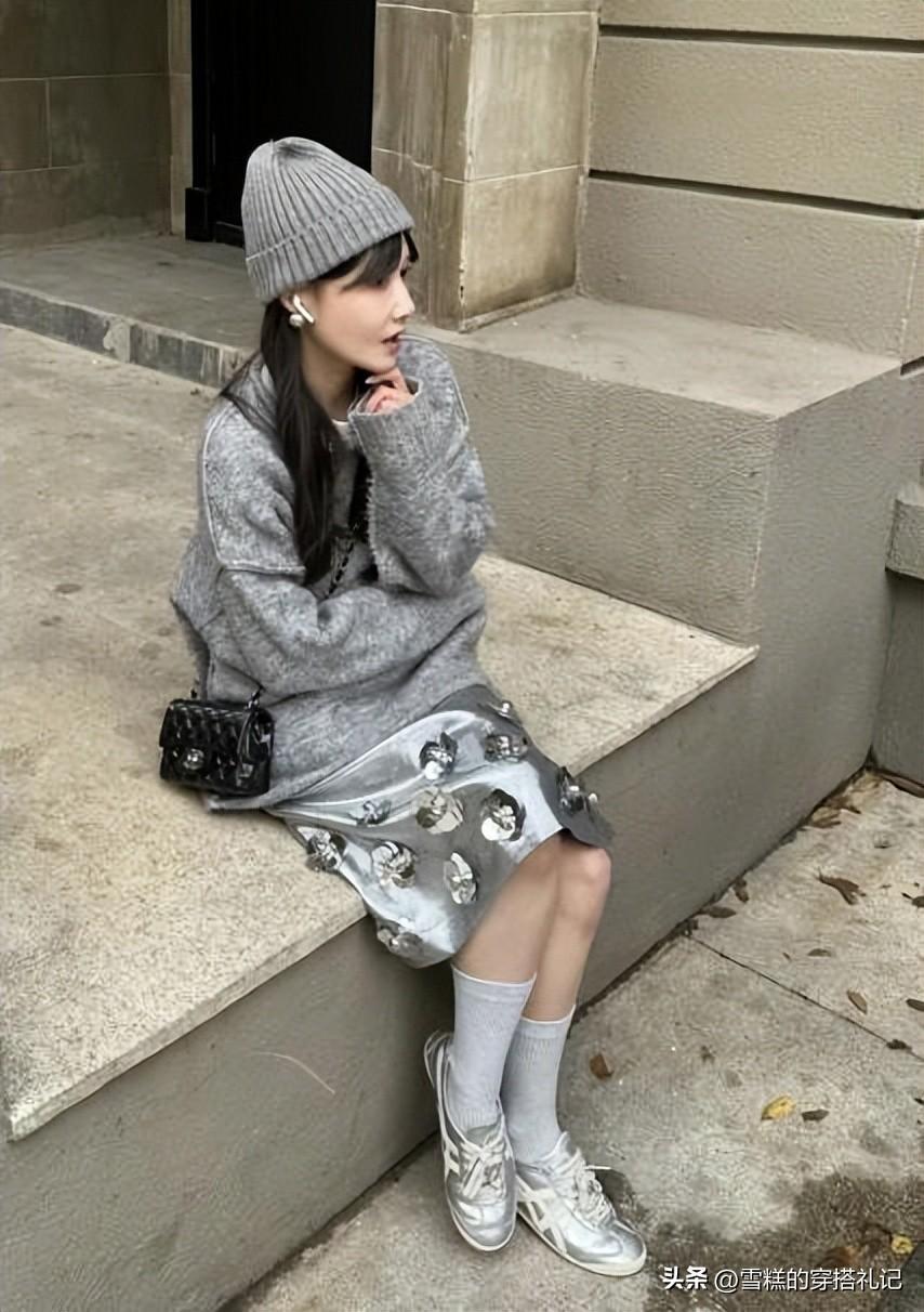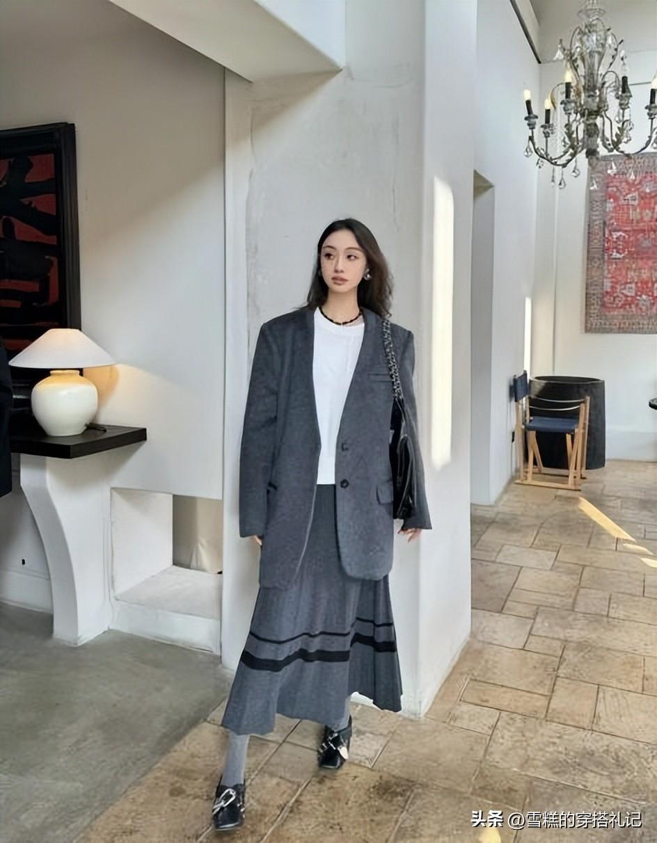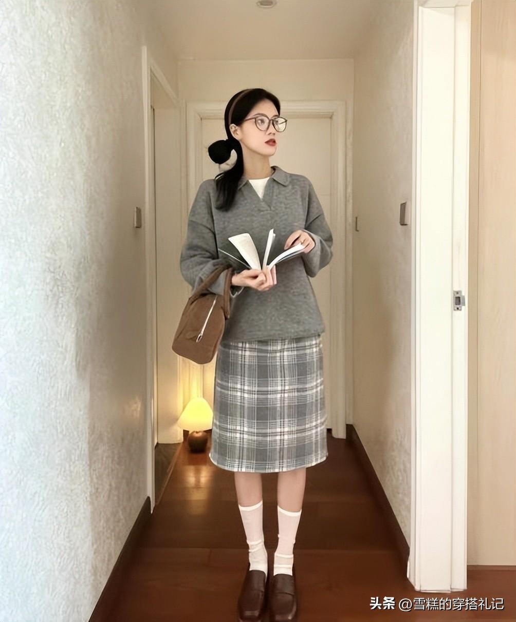 當然還有很多印花元素也是能夠展現復古感的,比如格紋元印花和波點印花的灰色半裙又可以用來塑造格雷系穿搭,都能爲格雷系的復古錦上添花的。