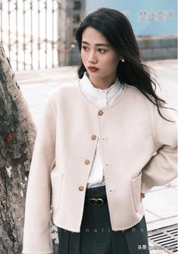 身高在一米六以下的女性朋友,建議不要穿太長的大衣,否則會壓低個子,顯矮顯胖,換成這種齊腰的短款效果會更好,一方面利用闊擺遮擋臀部的肉肉,另外一個方面利用大衣的挺括版型塑身,打造高挑的個子。